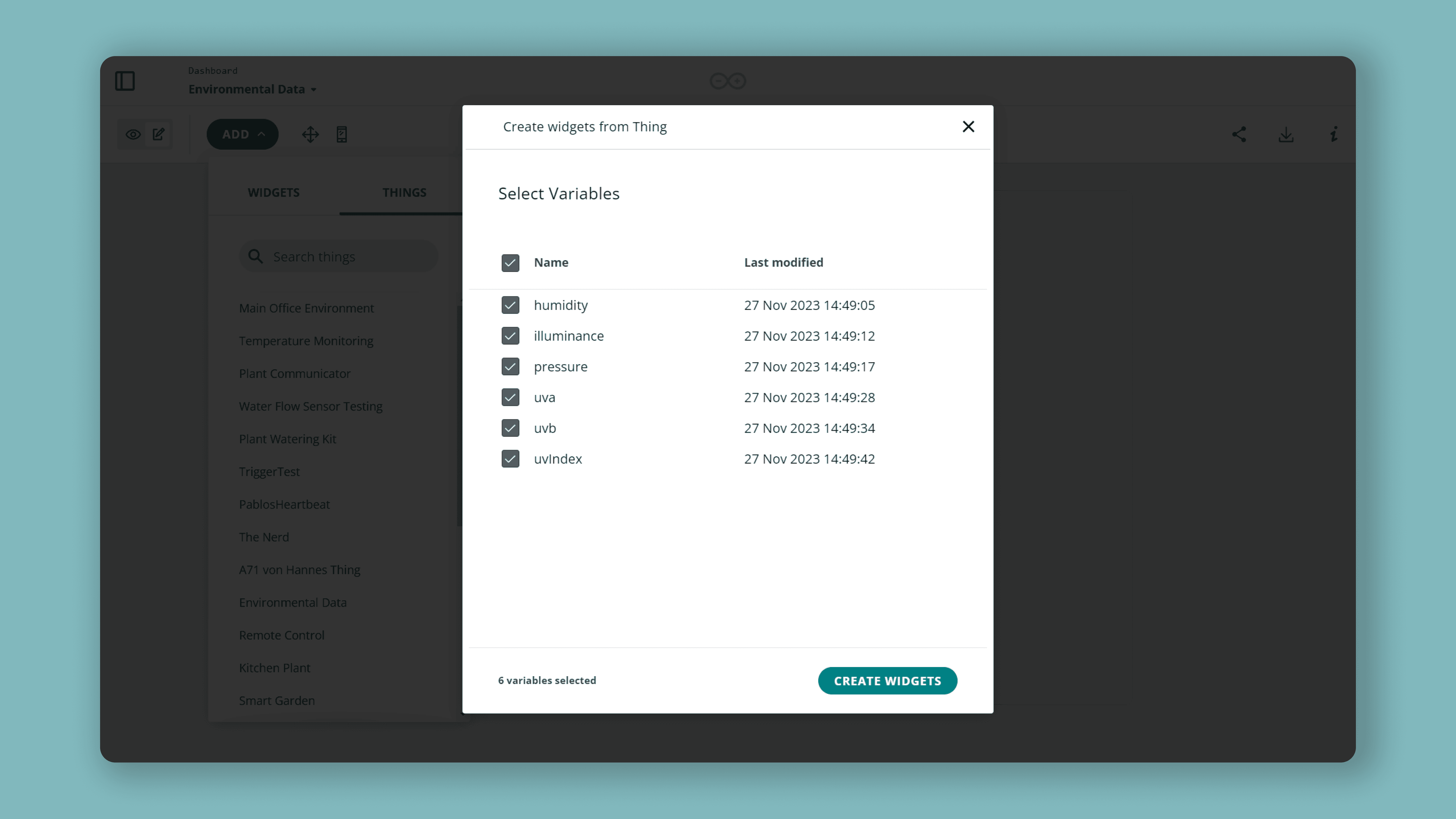 In this case, we changed the name to Environmental Data, but whatever you name your thing will appear here. By clicking on it, it gives you a list of variables with a checkpoint, and we can simply click "Create widgets"