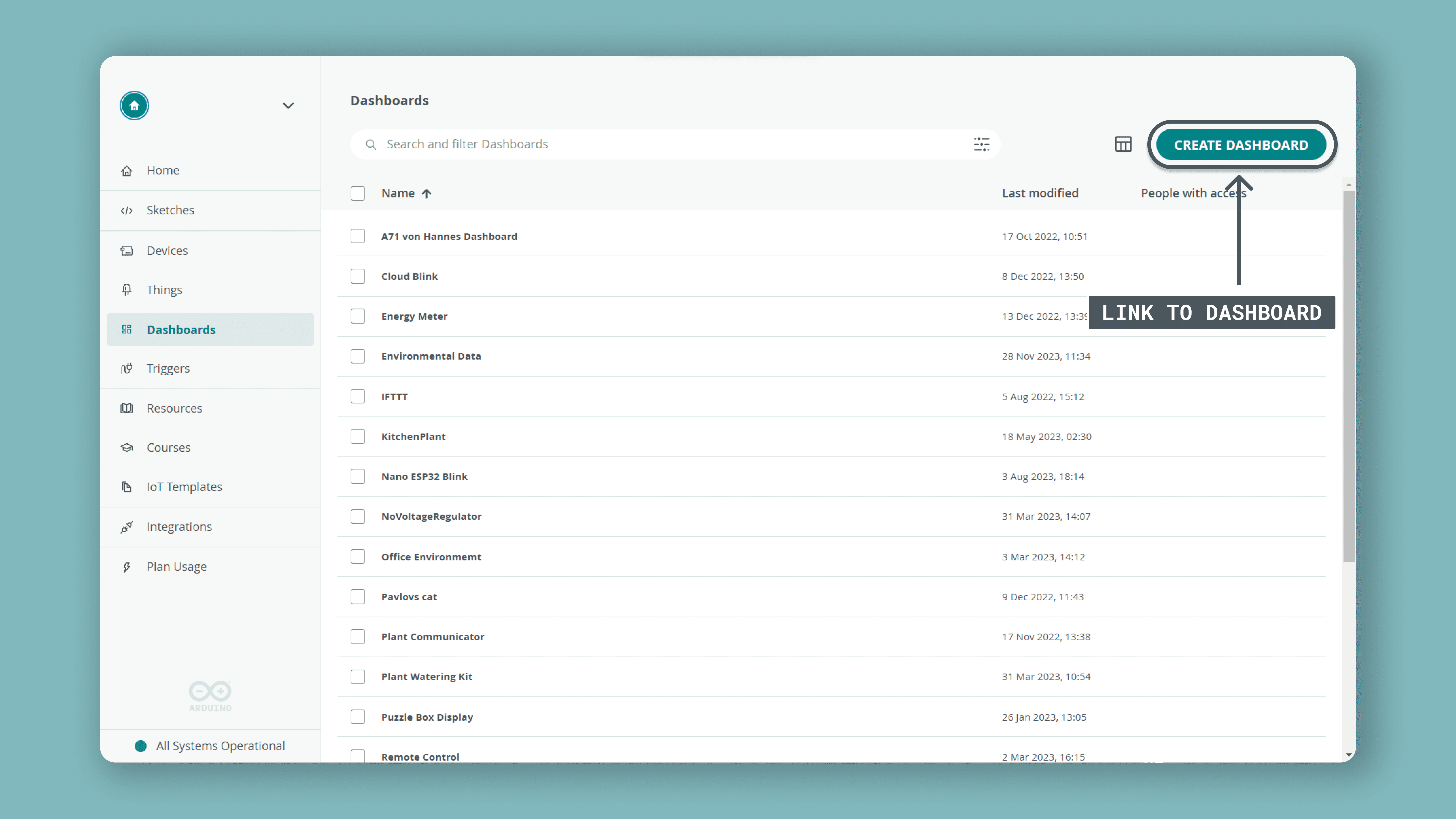 Once we have confirmed that the board is connected to the Cloud, the last step is to build the dashboard that we can monitor the environmental data in. Click on the "Dashboards" tab, which will take you to the dashboards page. Here, we need to click on the "Build Dashboard" button.