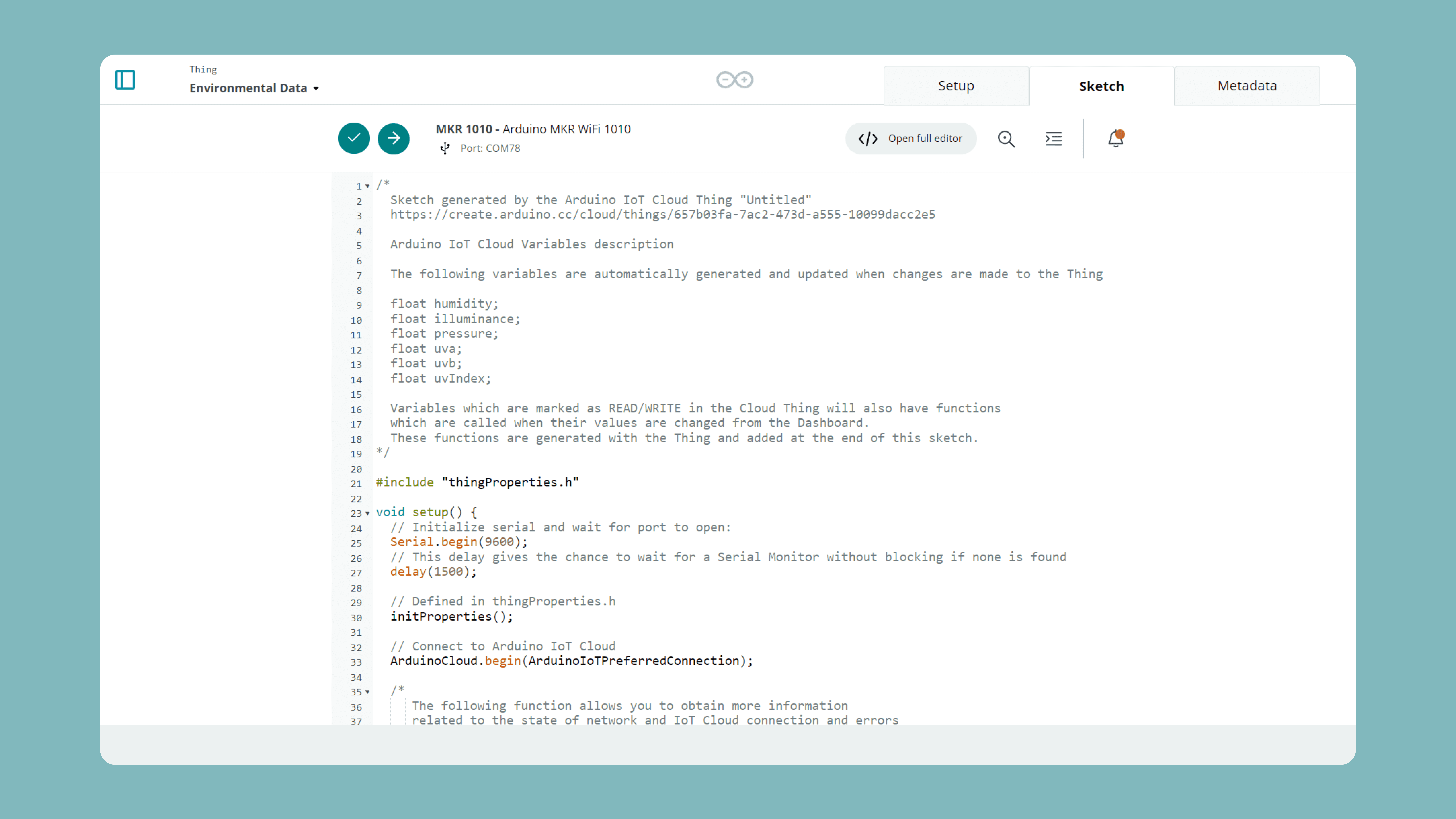 Now, the final thing needed is the actual program that will run on the MKR 1010 board. We can edit the program directly in the Arduino Cloud, by clicking on the "Sketch" tab. This will open up the built-in editor, where we can write the program directly.