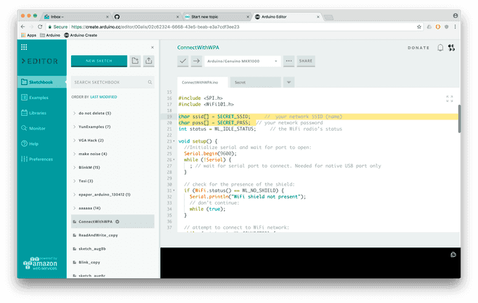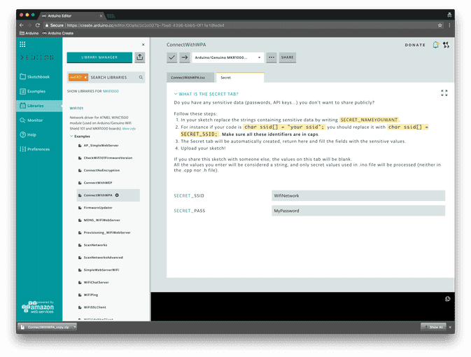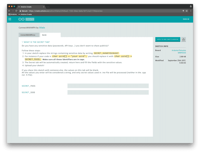 . If you now click on the tab called “Secret,” you will notice some input fields where you can fill in your data.If you have a MKR1000 lying around, you can upload this sketch on it and watch your board connect to Internet (just make sure you join a 2GHz WiFi network).