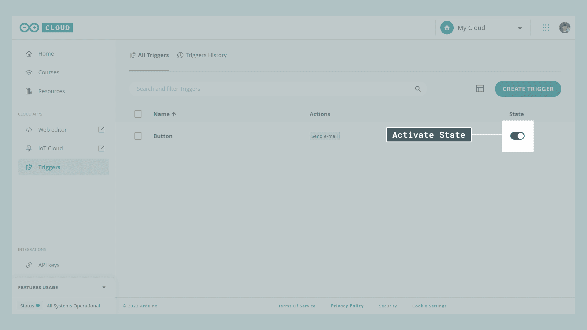 Triggers react to certain conditions inside your Arduino Cloud Thing, such as a boolean being true, or a string being assigned a value. As soon as a set condition is met a notification gets triggered and sent to you. This is useful when you monitor data and you need to know about any change as soon as it happens. This could be anything from different values in environmental monitoring or security-related information such as movement detection.