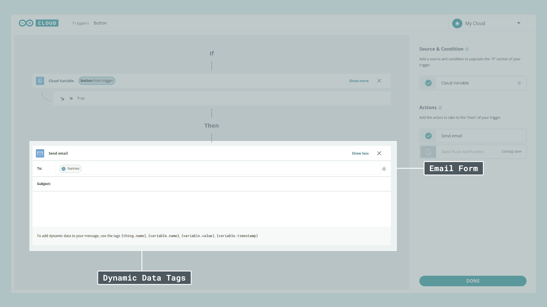 by using the tags shown at the bottom, to include variable data from your sketch in the messages sent to your email.7. Once you're finished press Done. The final step is to turn on the State switch and now your trigger is ready to be used.
