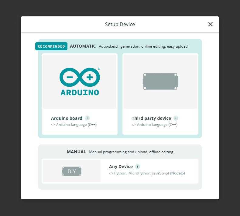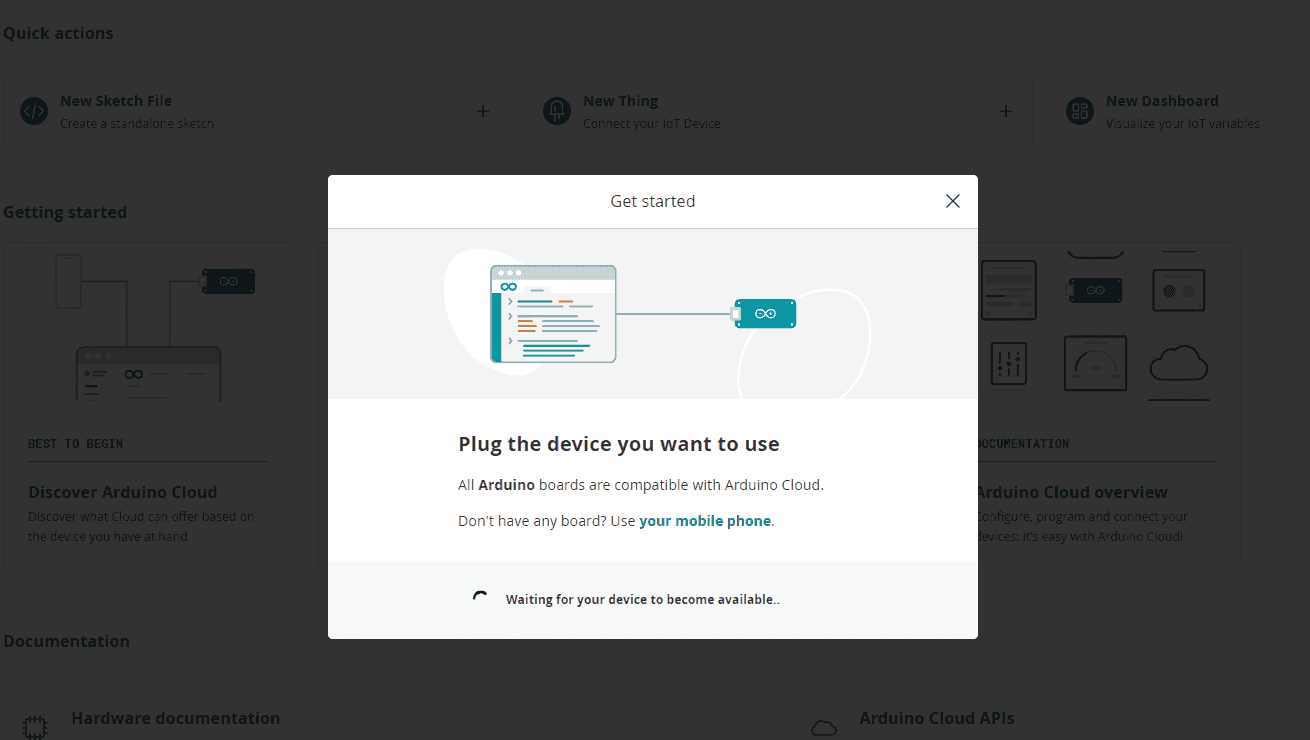 If your device is compatible with Arduino Cloud, you can start to Setup Device by connecting it to your computer through a USB cable, going to