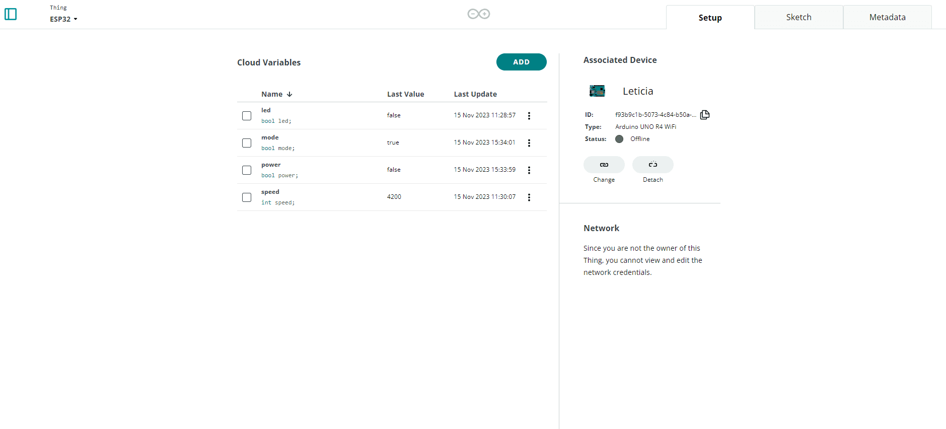 To use a device in Arduino Cloud, you need to create a Thing, or associate it to an existing Thing. A Thing is the digital twin of your device, like a reference to the actual hardware used to implement them. Each Thing is represented by a collection of properties, the configuration of some variables and other settings, as well as the history of the data collected for those variables.