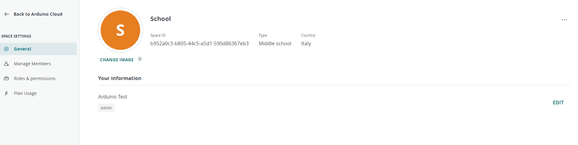 Private Space. Private space is an automatically created private space once joined Arduino Cloud. You can use this space for personal projects you do not want to share with all your class. This space is free and includes