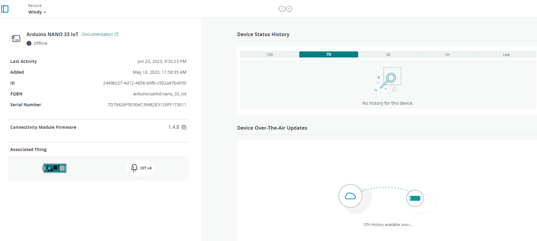 , more information about the device, such as its ID number, FQBN, serial number, firmware version, Device Status history, and the date when the device was added.