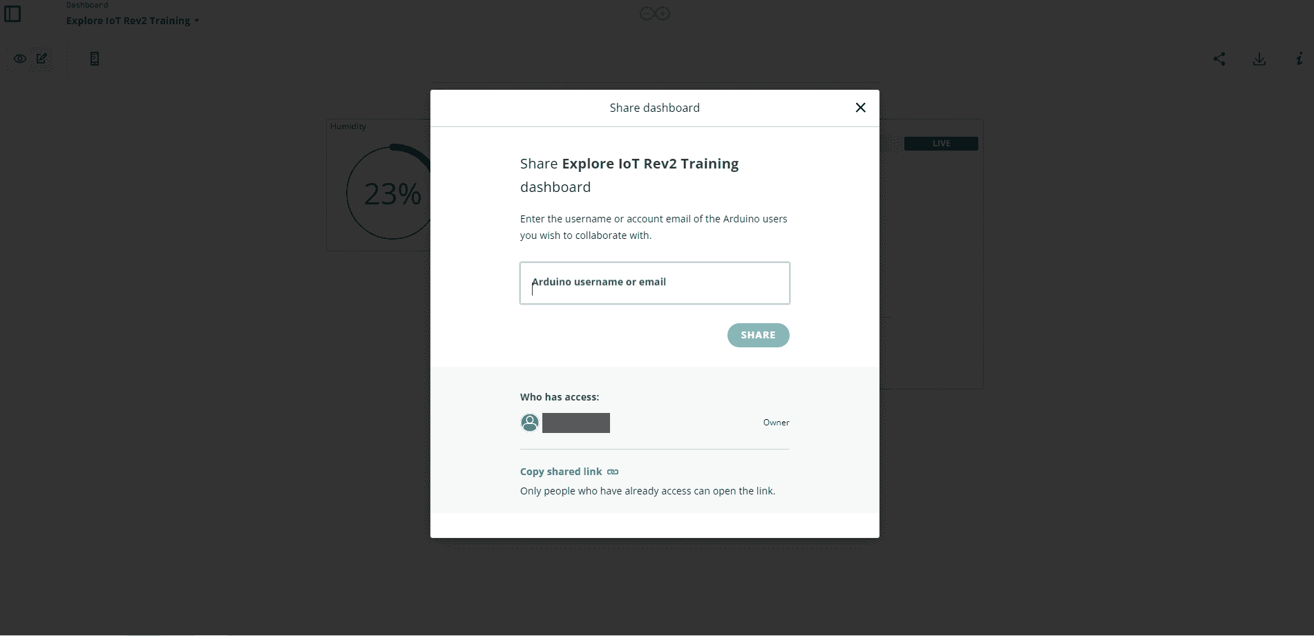 With a School Plan is possible to share any Dashboard with anyone. Go to the Dashboard tab in Arduino Cloud, go inside the Dashboard you would like to share, click on the three dots, next to the download button.