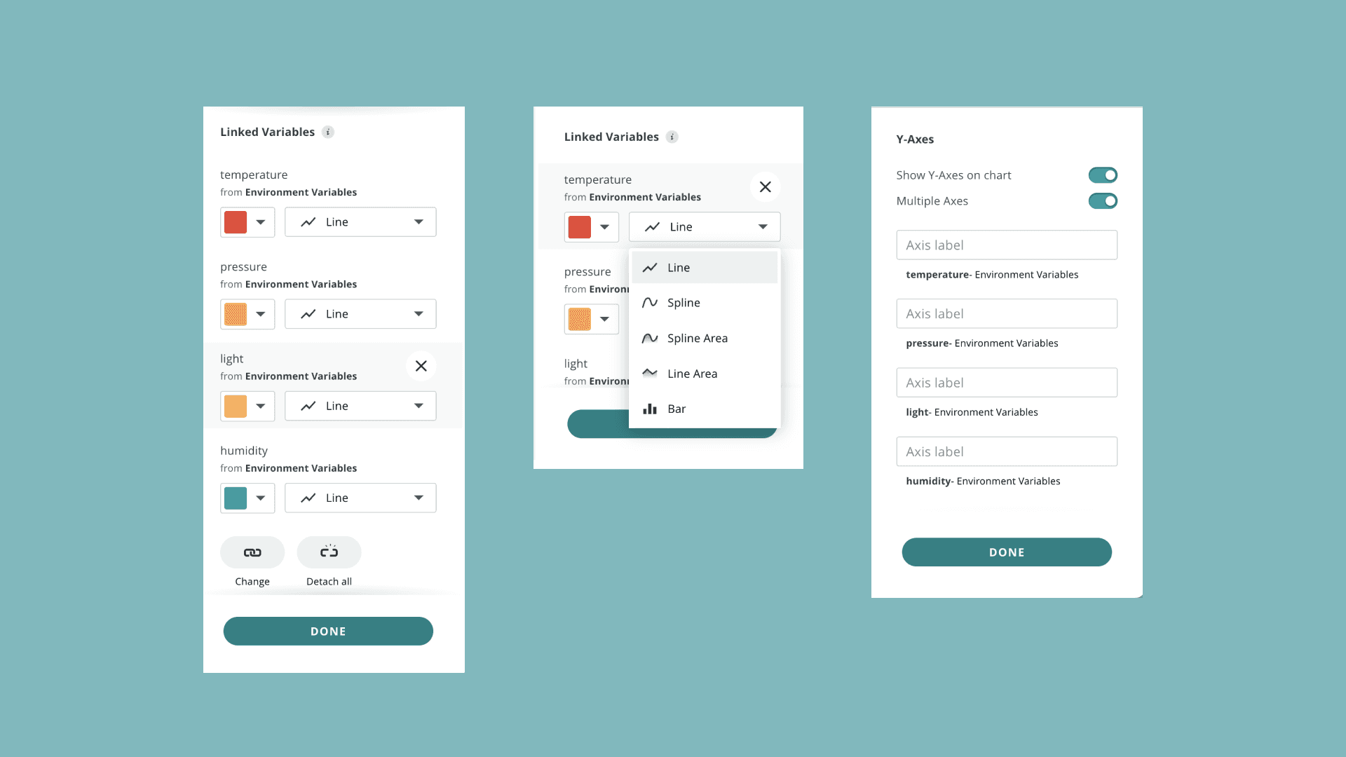 4. After selection, your variables will appear in the right panel, with a number of configuration options. You can for example choose how each data point will be represented (line, spline, spline area, line area and bar).