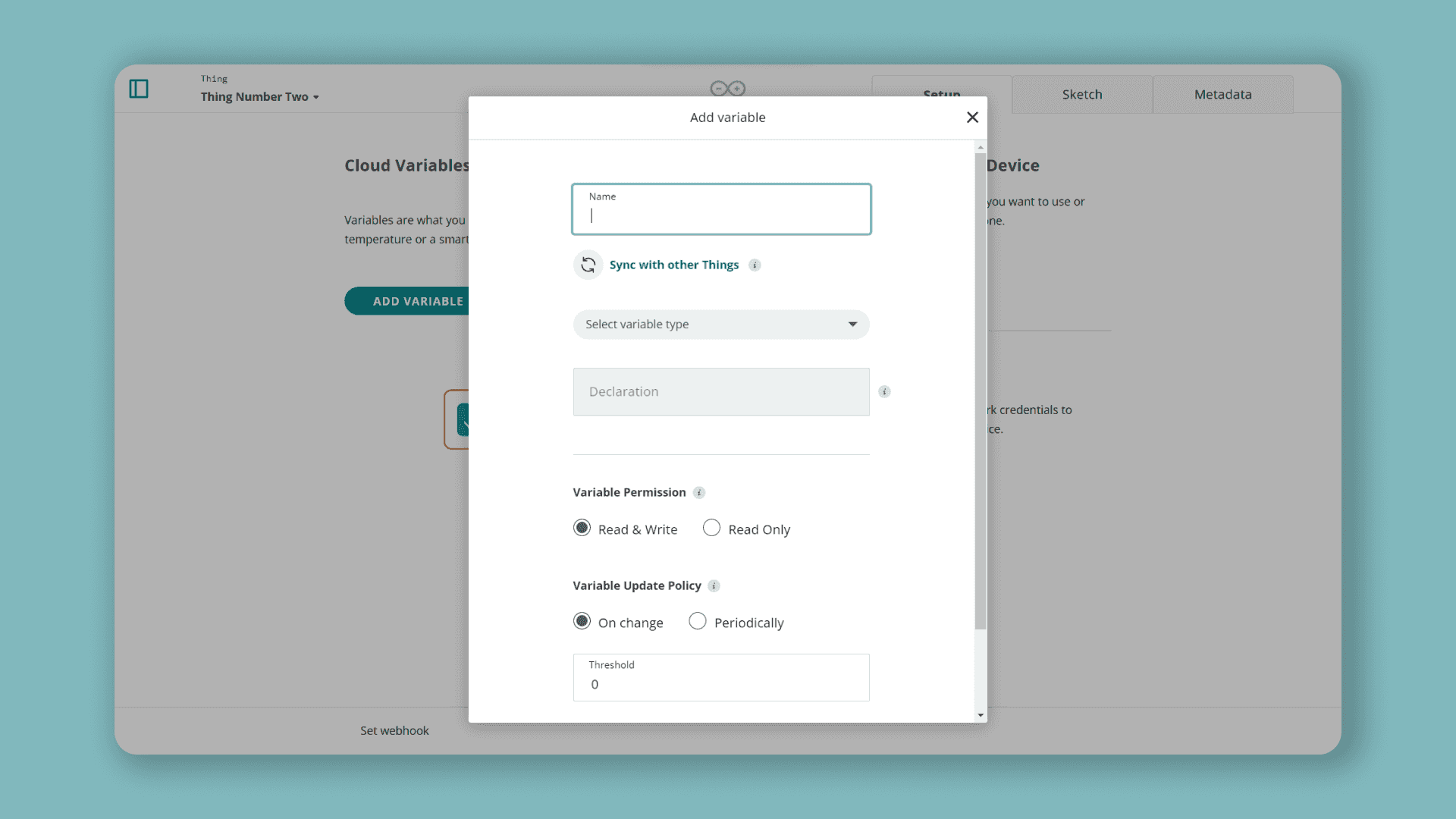Now, we need to create the variables we want to sync with the other Thing. First, click on the "Add Variable" button. We will now click on the "Sync with other things" option.