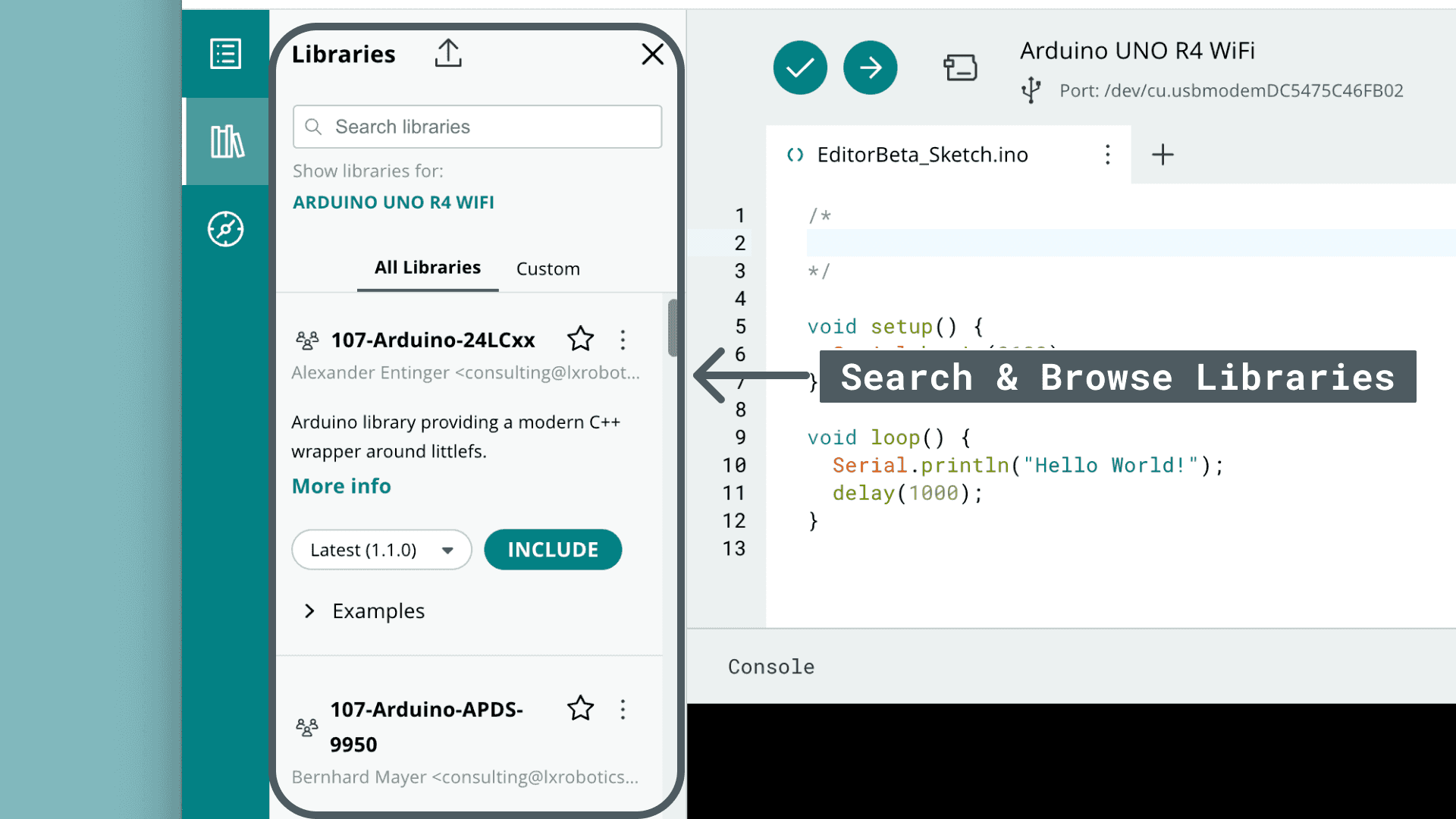 The Cloud Editor features all the necessary tools to develop and test your Arduino projects, including:
