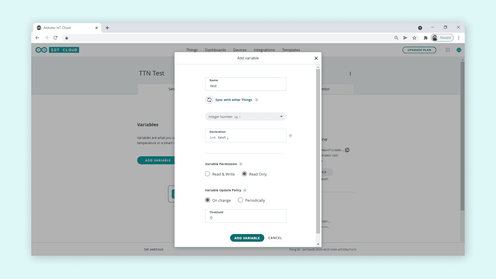 1. After TTS registration is complete, head back to the Arduino Cloud, and to the Thing you created earlier. Here, we will need to click on the "Add Variable" button, following the image below: