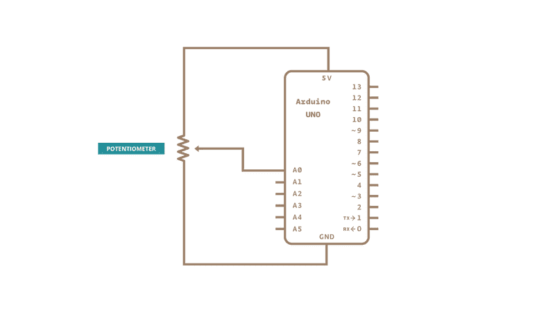 Connect three wires to the Arduino board. The first goes to ground from one of the outer pins of the potentiometer. The second goes from 5 volts to the other outer pin of the potentiometer. The third goes from analog input 0 to the middle pin of the potentiometer.