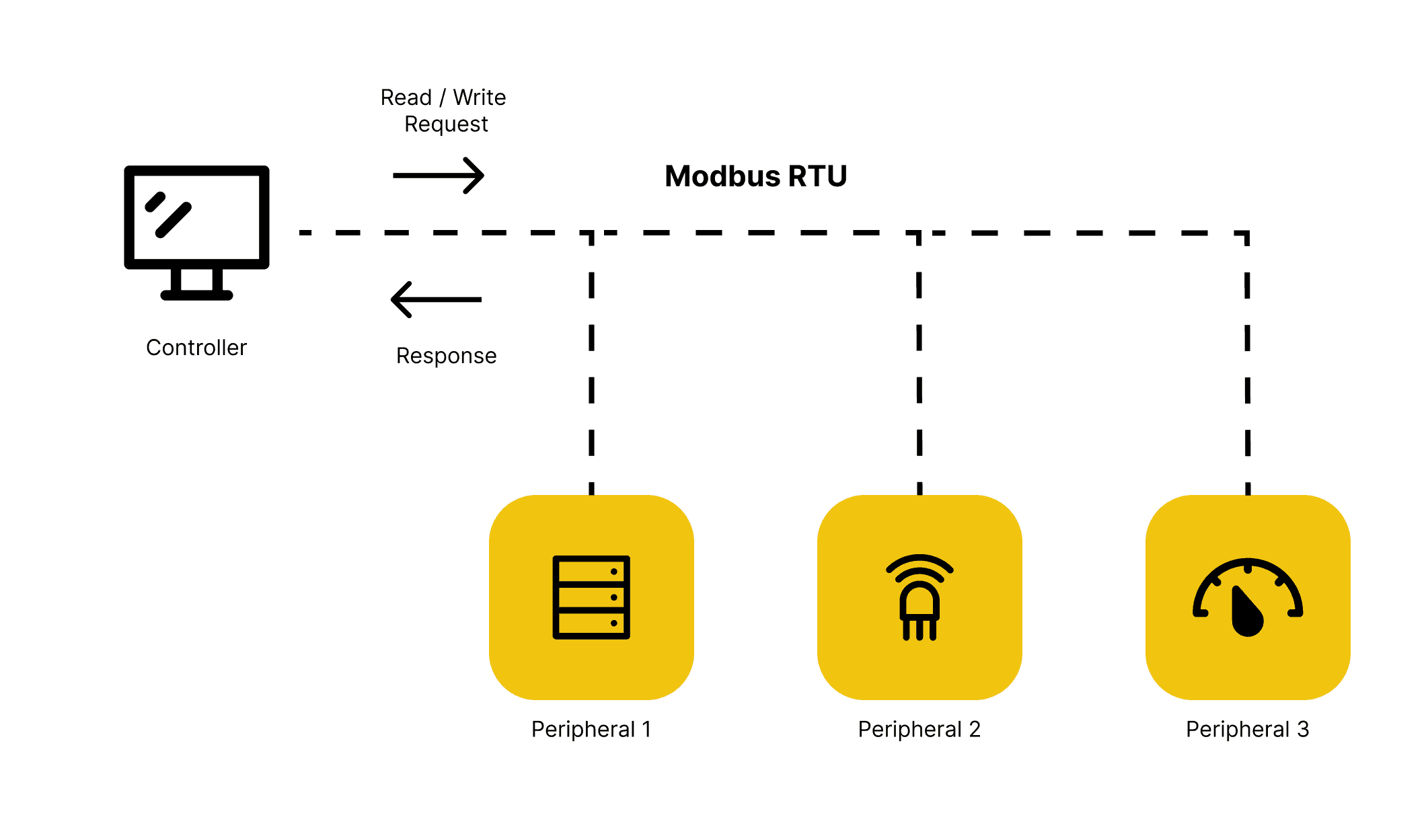 Every peripheral device has its own address which it responds to when addressed by the controller. All other devices ignore the message if the address doesn't match their own. Device addresses are assigned in the range of 1 - 247, but without additional hardware, the stable number of devices should be limited to 32 as it could cause instability when attaching more devices.