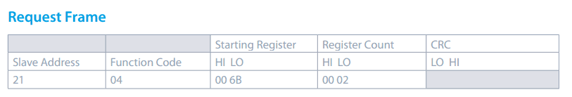 The starting register is 00 6B (or 0x6B) but for the Modbus library to work we need to change it from hexadecimal to decimal. In this example, the starting register is stated as hexadecimal but if we scroll down further in the documentation we can see that the registers are written in decimals: