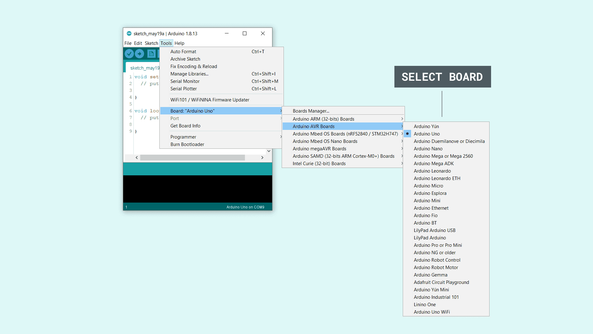 6. Now, you need to select the right core & board. This is done by navigating to Tools > Board > Arduino AVR Boards > Board. Make sure you select the board that you are using. If you cannot find your board, you can add it from Tools > Board > Boards Manager.