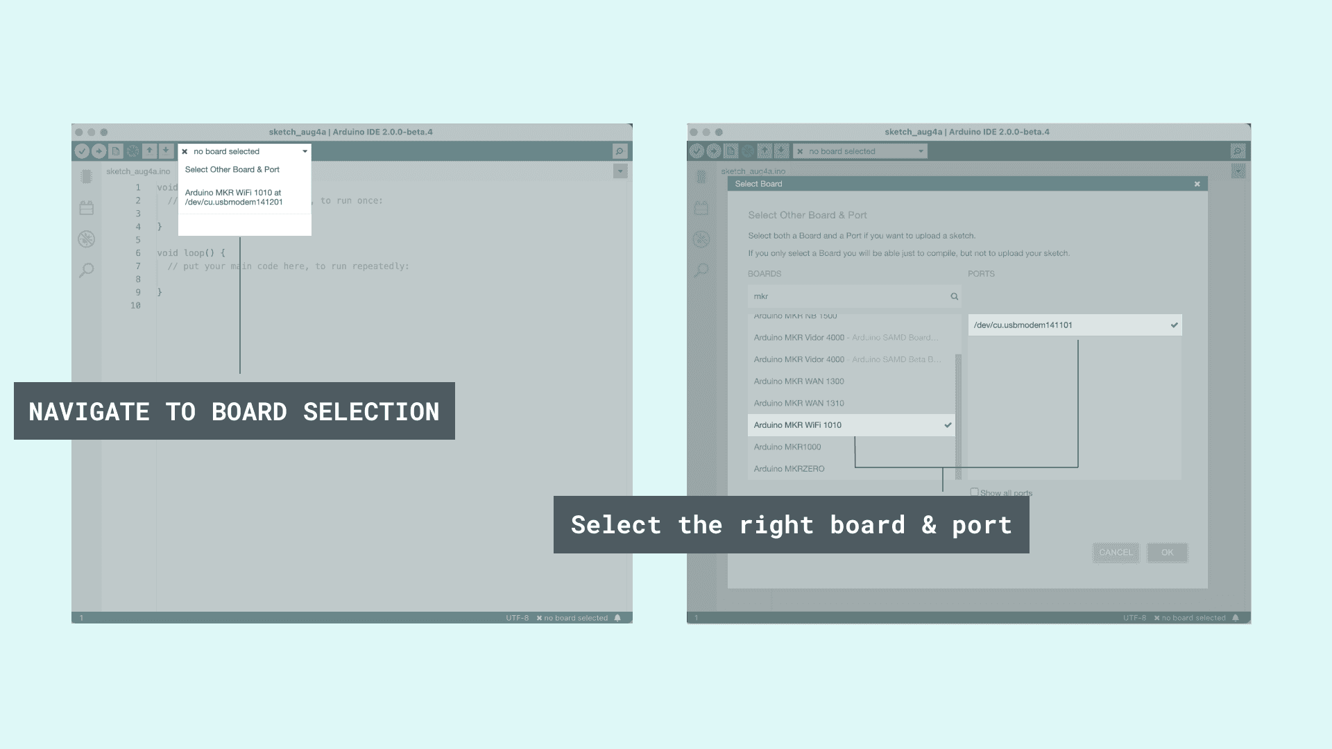 2. Now, you need to select the right board & port. This is done from the toolbar. Make sure you select the board that you are using. If you cannot find your board, you can add it from the board manager in the sidebar.