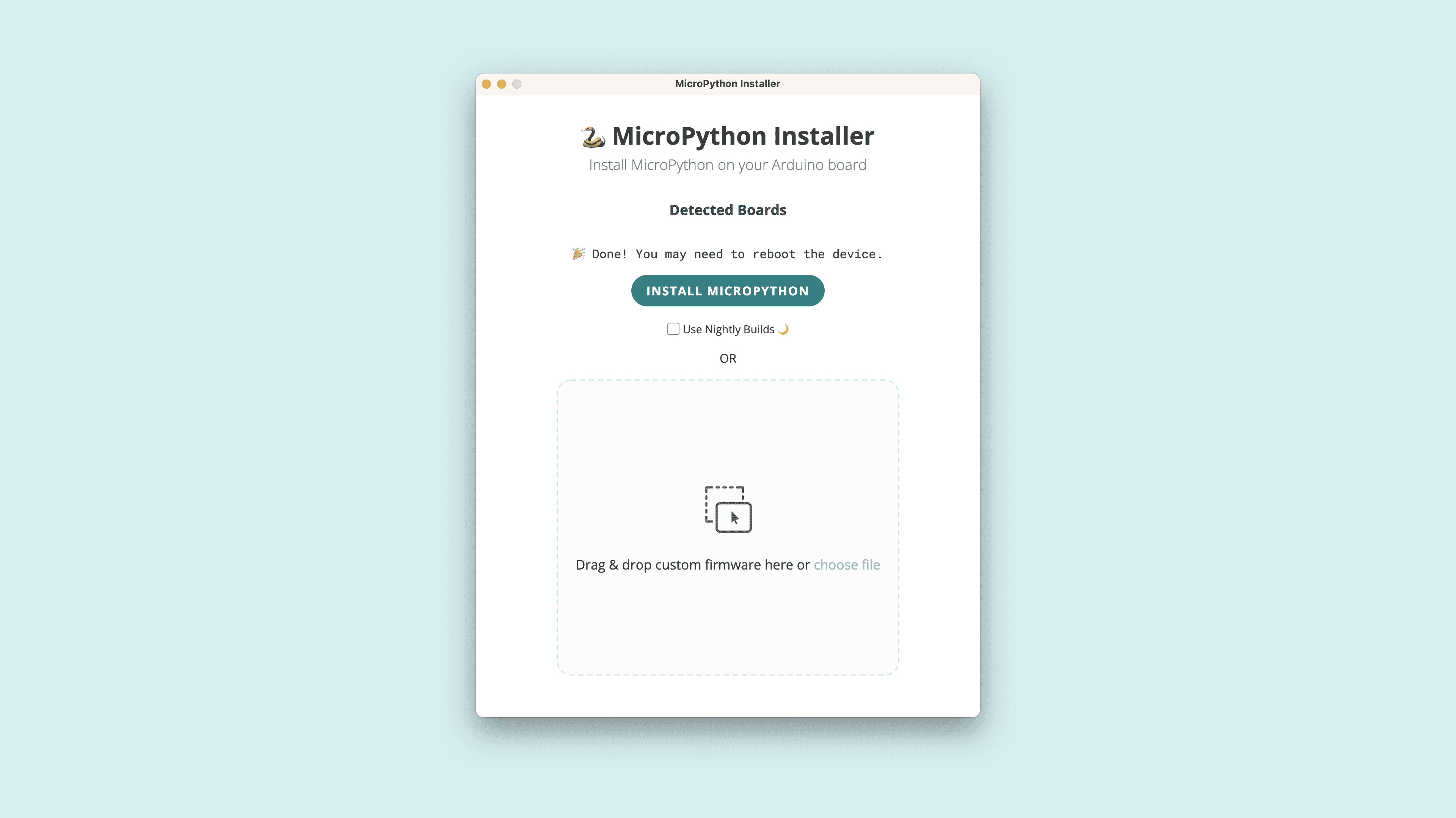 We have developed a tool for installing the MicroPython firmware to your Arduino boards with a simple click. This tool lets you plug in the board, select it from a menu, and automatically flash the latest firmware, or a custom one of your choice to the board.