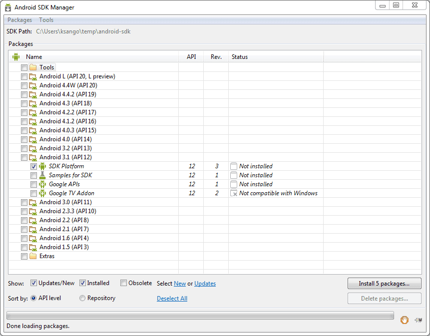 Open the SDK Manager and install Android 3.1, as shown in Figure 3.