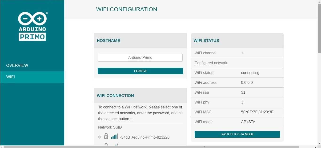 Your Arduino Primo needs a first configuration to join your WiFi network and it allows you to enter the relevant information creating its own Access Point. Please execute the following procedure every time you bring Arduino Primo in a location where the WiFi network access needs to be reconfigured.