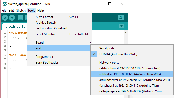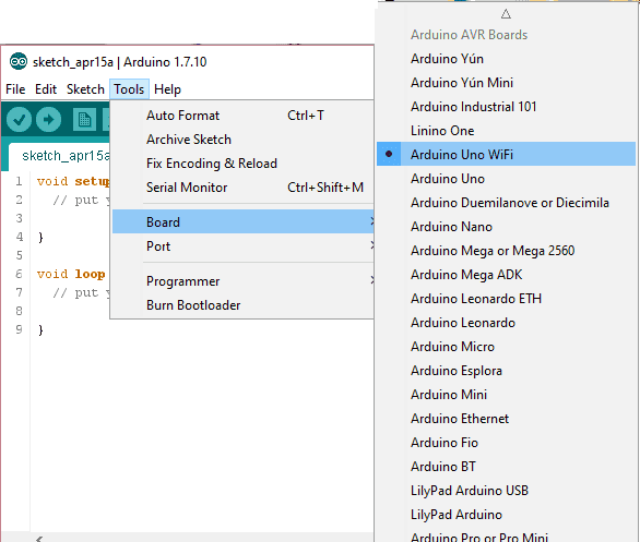 • Select the board: Arduino UNO WiFi from Tools>Board menu.