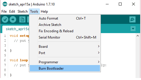 • Click on Burn Bootloader from Tools menu.