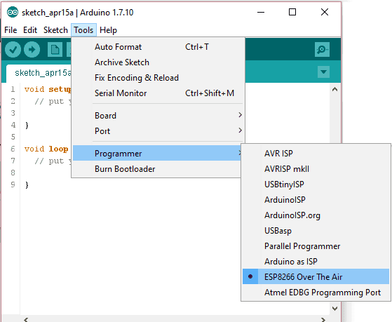 • Select the Programmer from Tools>Programmer>ESP8266 Over The Air menu.