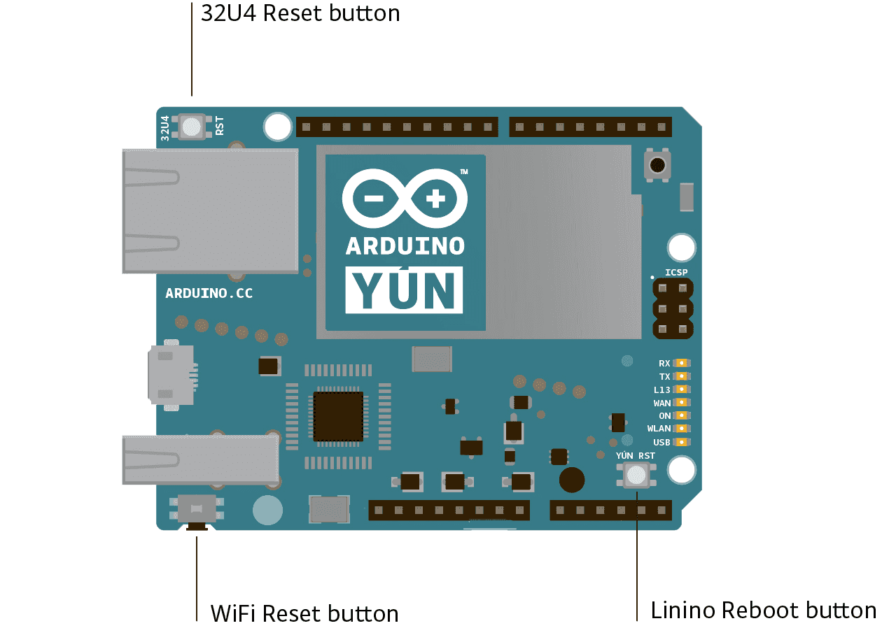 To restart the AR9331, which reboots OpenWrt-Yun, press the "YÚN RST" reset button that is close to the analog inputs pins and the LEDs of the board.