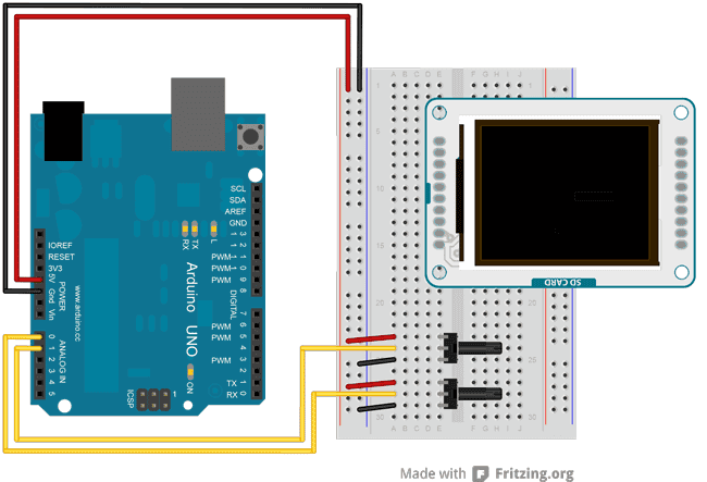 Connect the BL and +5V pins to power, and GND to ground. Connect CS-LD to pin 10, DC to pin 9, RESET to pin 8, MOSI to pin 11, and SCK to pin 13. If uyou're using a Leonardo, you'll be using different pins. see the getting started page for more details.
