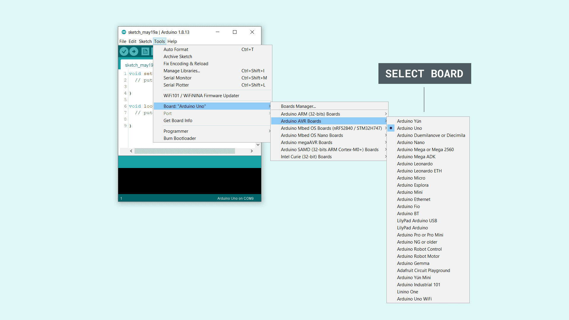 In this tutorial, we will simply show how to select the right board, choose the right port, and how to upload the classic blink example to our board, a simple program that makes your LED blink every second.