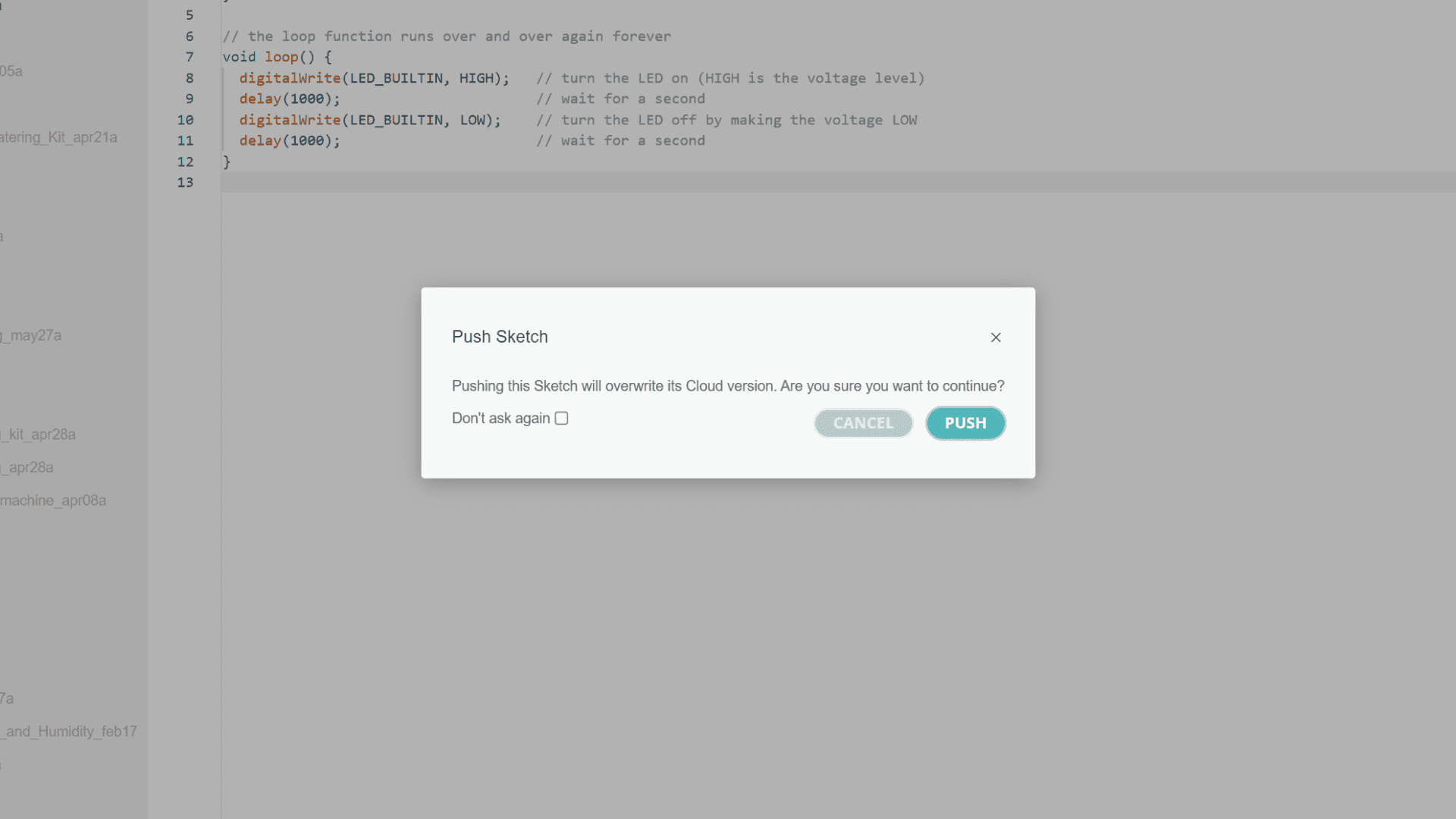When we are finished editing, we need to push it back to the Arduino Cloud. This is done by clicking the cloud with an arrow pointing up icon.