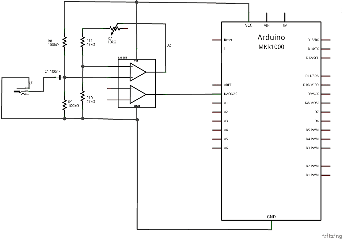 In order to get the most dynamic range even from low level inputs, the circuit consist of a non-inverting amplifier that brings the amplitude of the signal to the full input voltage range supported by the ADC. Sampling at full resolution means a better accuracy.