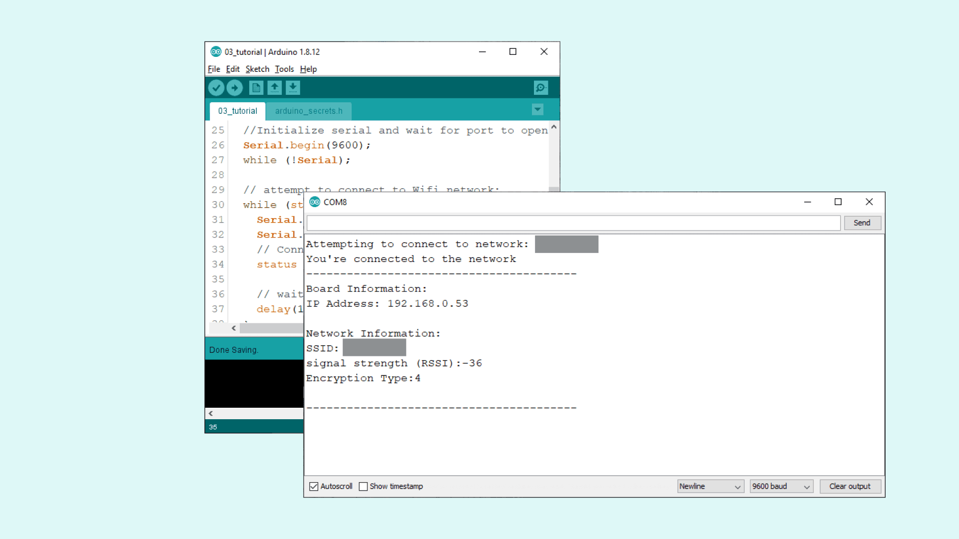 Once we are finished with the coding, we can upload the sketch to the board. When it has been successfully uploaded, open the Serial Monitor and the results should match the following images. Note that the network information in this example is greyed out for security reasons.