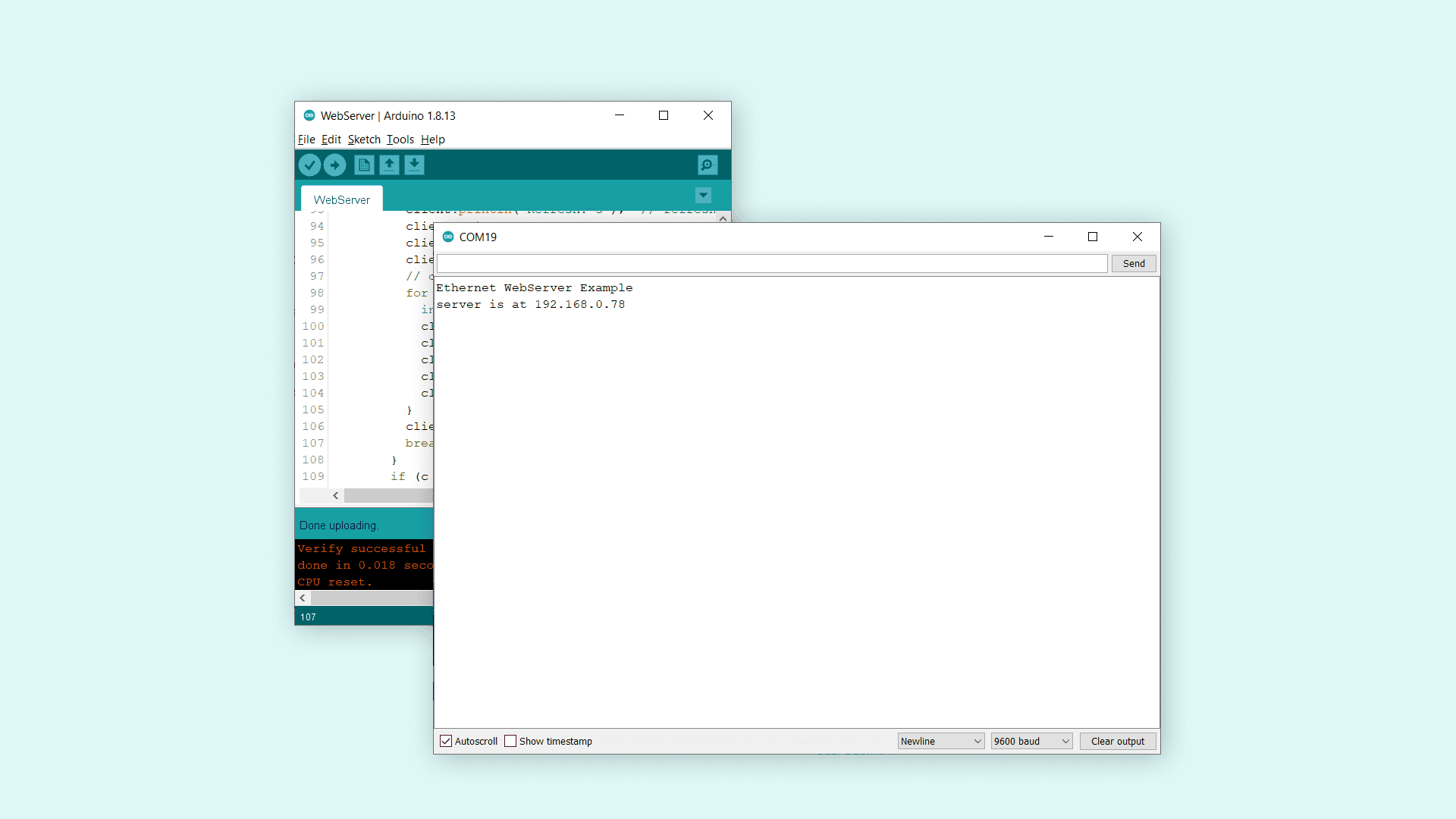 20 // Open serial communications and wait for port to open:21 Serial.begin(9600);22 while (!Serial) {23 ; // wait for serial port to connect. Needed for native USB port only24 }25 Serial.println("Ethernet WebServer Example");26