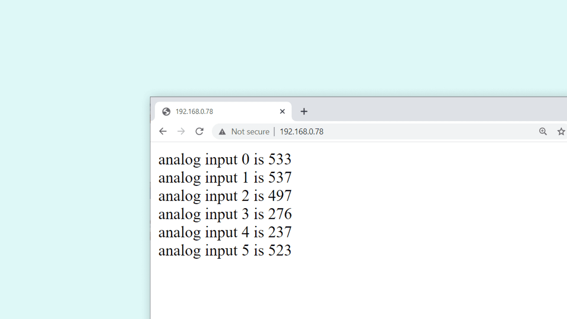 The content is simply the recent reading of pin A0-A5 on the board, which is then printed to the client. Congratulations, you have now managed to access data from your MKR board from a different device. The page is set to refresh every 5 seconds, so the values update along with it.