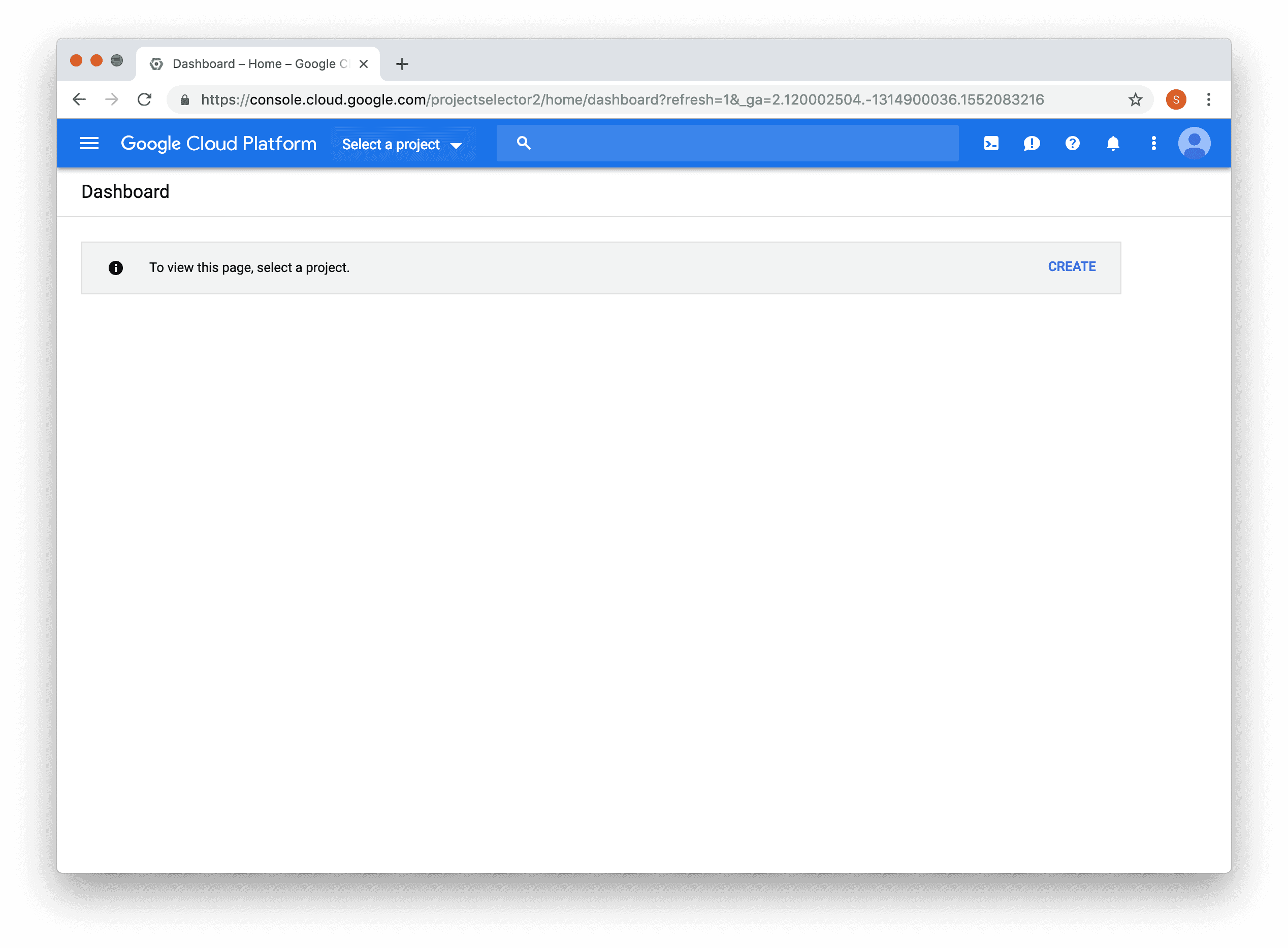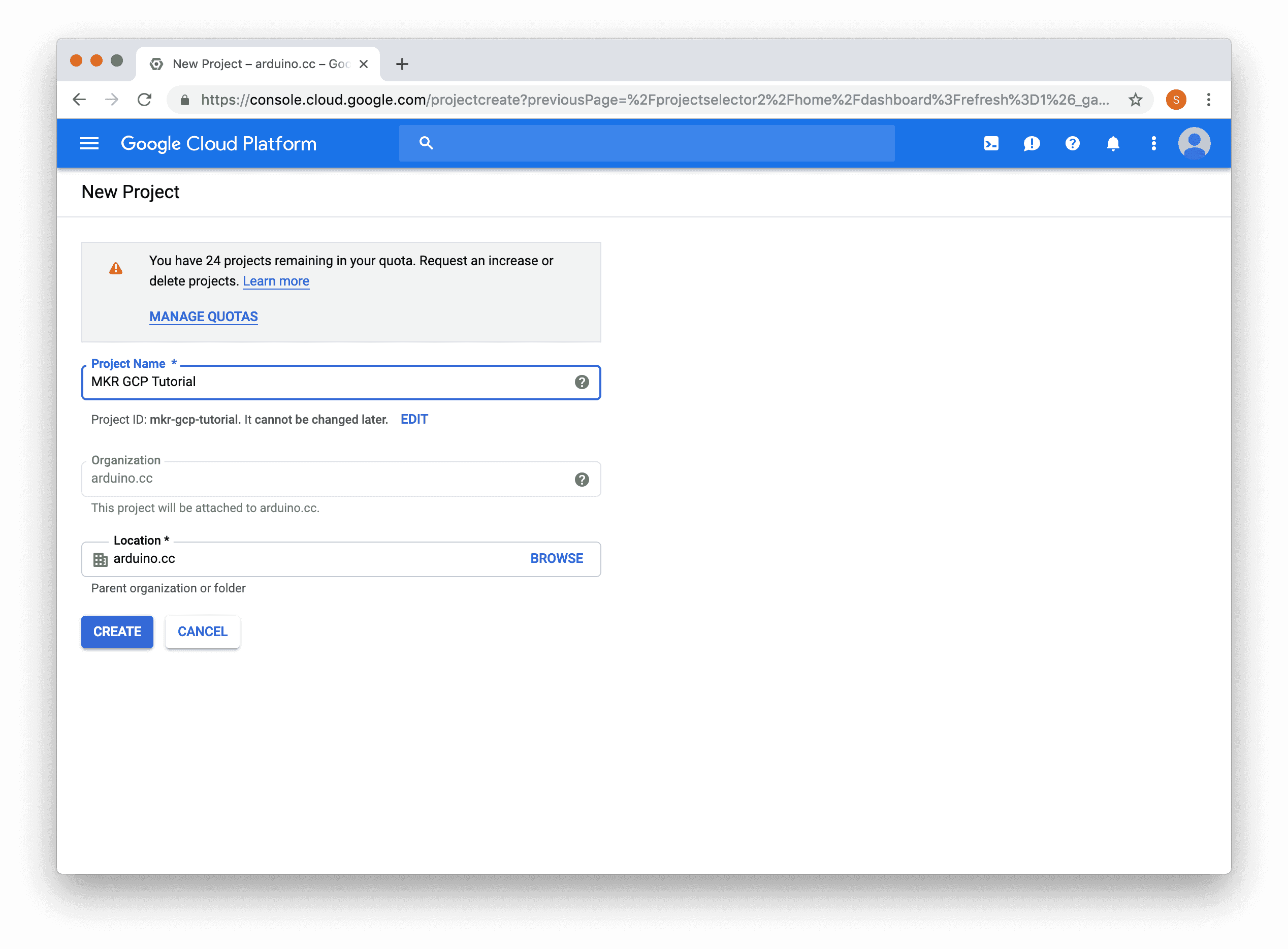 You will be prompted for a project name, we'll be using "MKR GCP Tutorial" for the name. Click the "CREATE" button to continue.