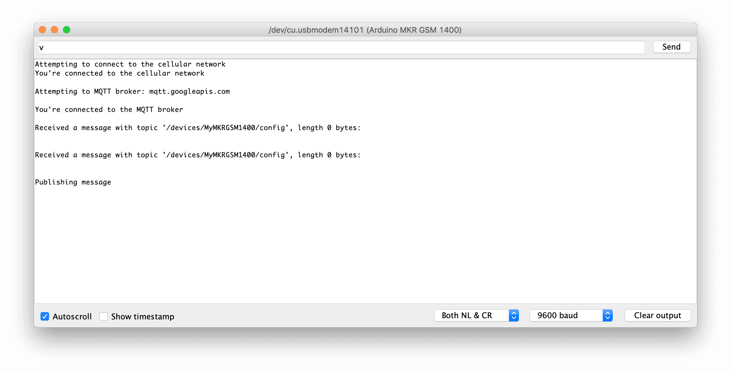5) Upload the sketch below to your board and open the serial monitor. The board will attempt to connect to the cellular network and if successful try to connect to GCP IoT Core using MQTT.