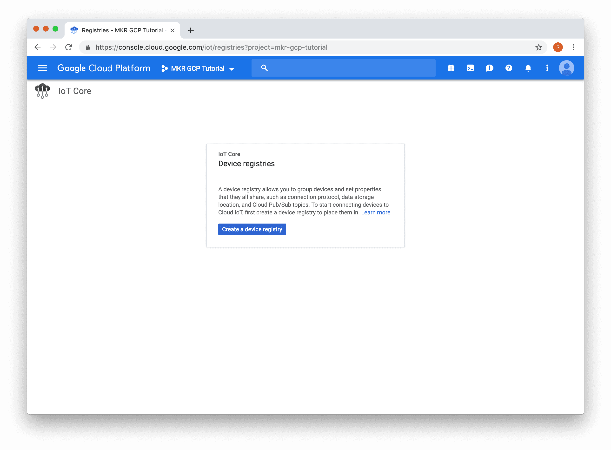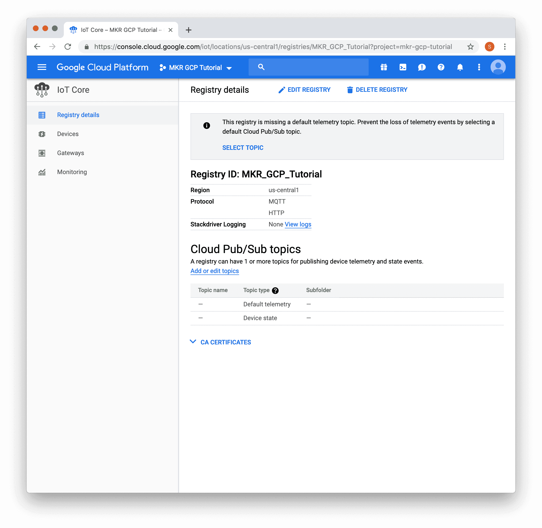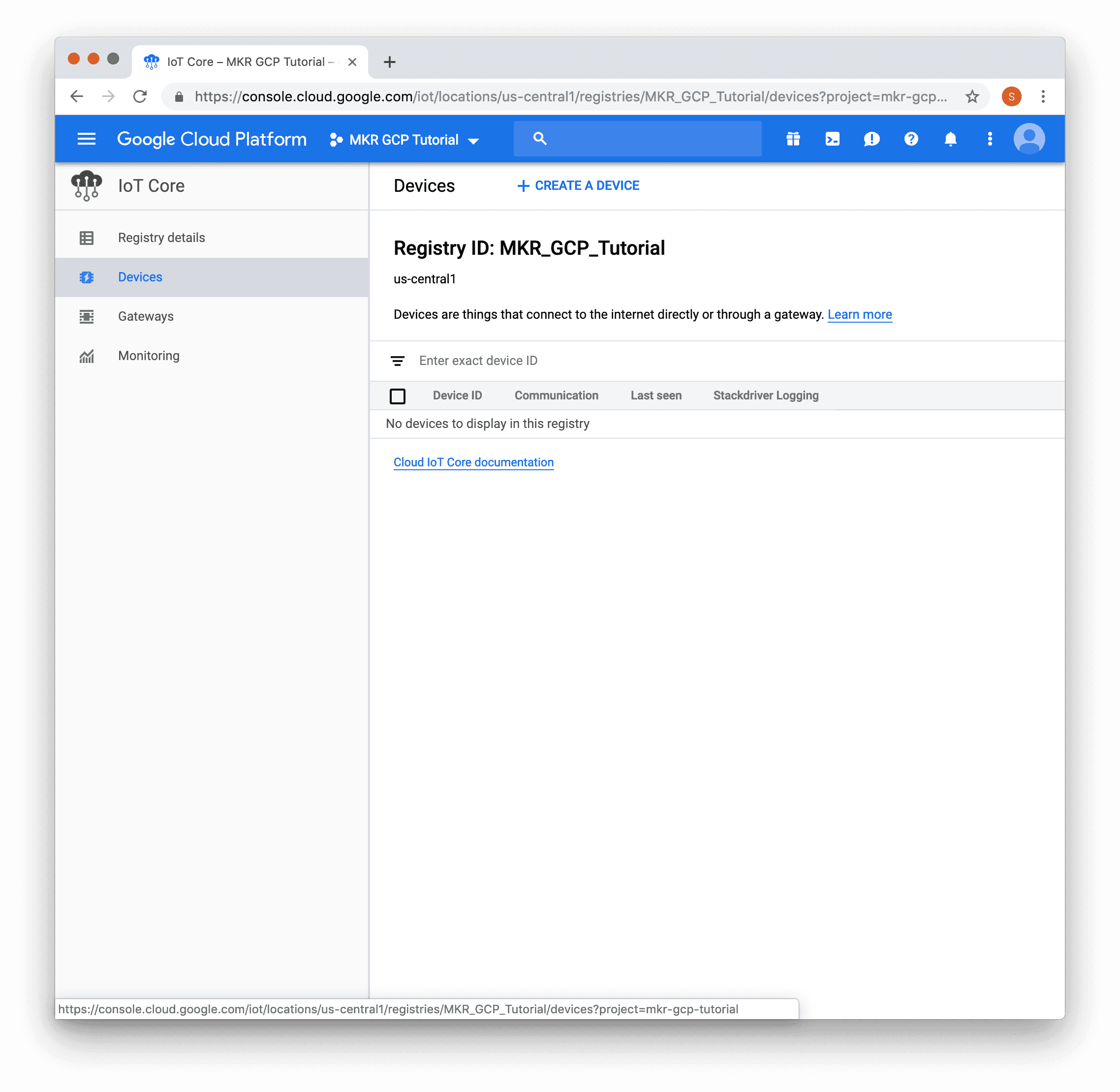 Now that we have a PEM public key, we need to login into the GCP IoT Core console and create a new device for it.