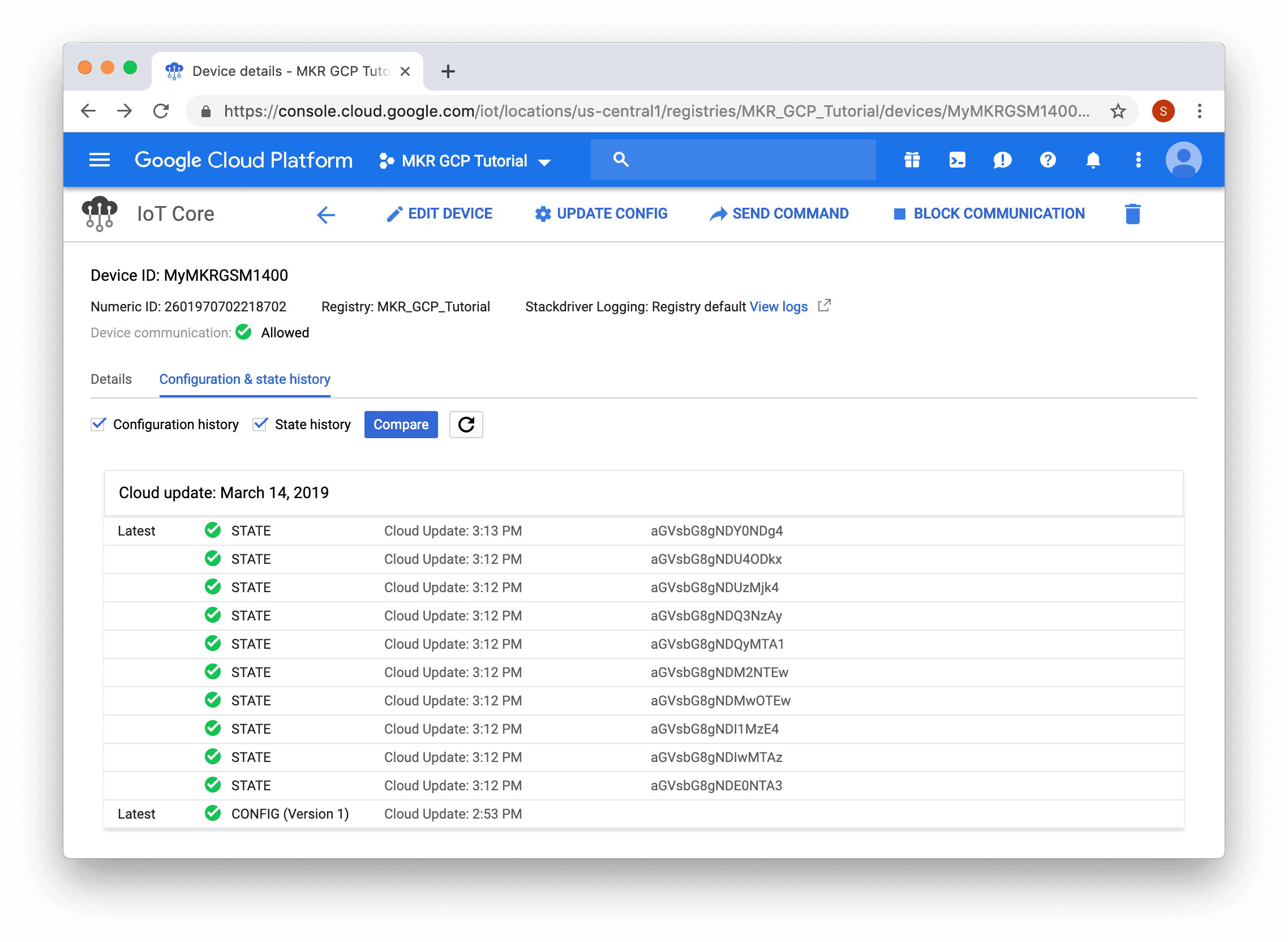 Now that your board has successfully connected to GCP IoT Core, we can use the GCP IoT Core console to interact with it. The sketch sends a message to the /devices/{deviceId}/state topic every 5 seconds and listens for messages on both /devices/{deviceId}/config topic and /devices/{deviceId}/commands/# topics.