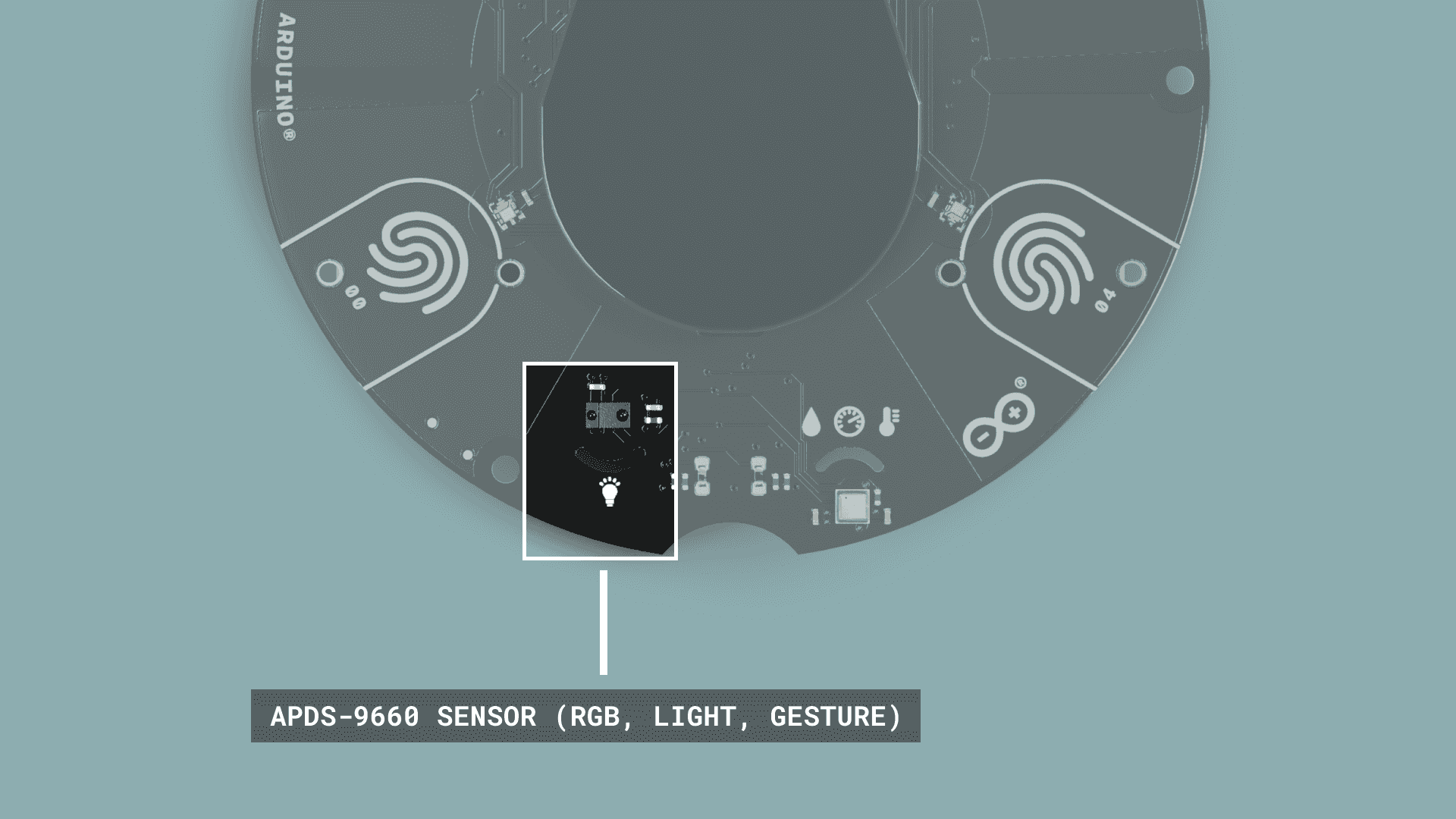 The MKR IoT Carrier Rev2 contains a Broadcom APDS-9960 RGB and Gesture sensors, situated under the display and marked with a bulb icon. The sensor is useful for ambient light and RGB color sensing, proximity sensing, and gesture detection.
