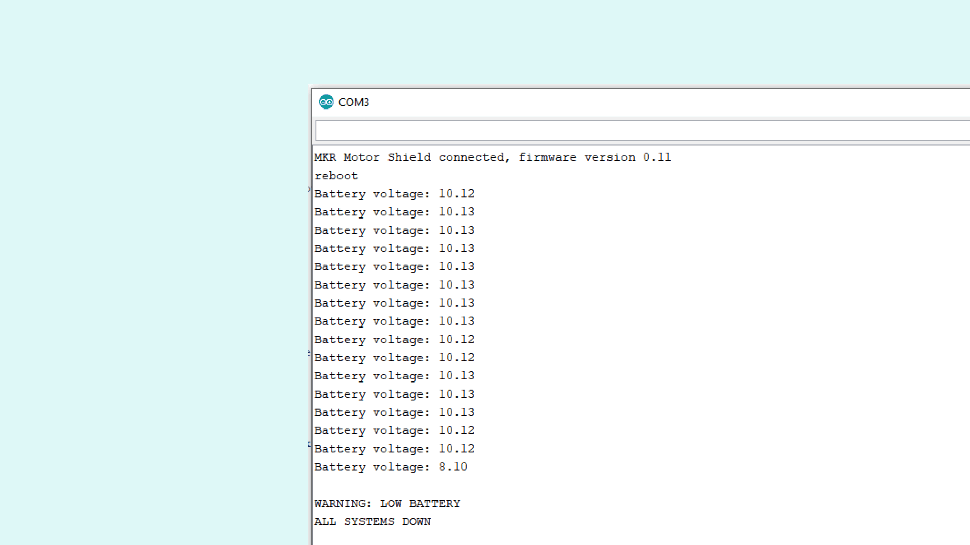In case the battery is discharged, we are turning OFF all the motors and sending an error message. This is visible in the Serial Monitor.