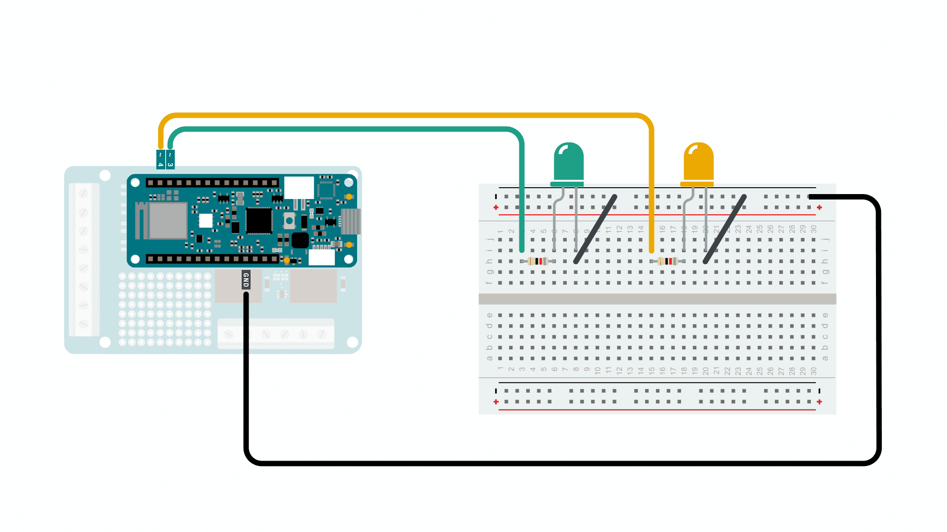 Optional: We can then assemble the circuit for the LEDs, using a breadboard, resistors and jumper wires.