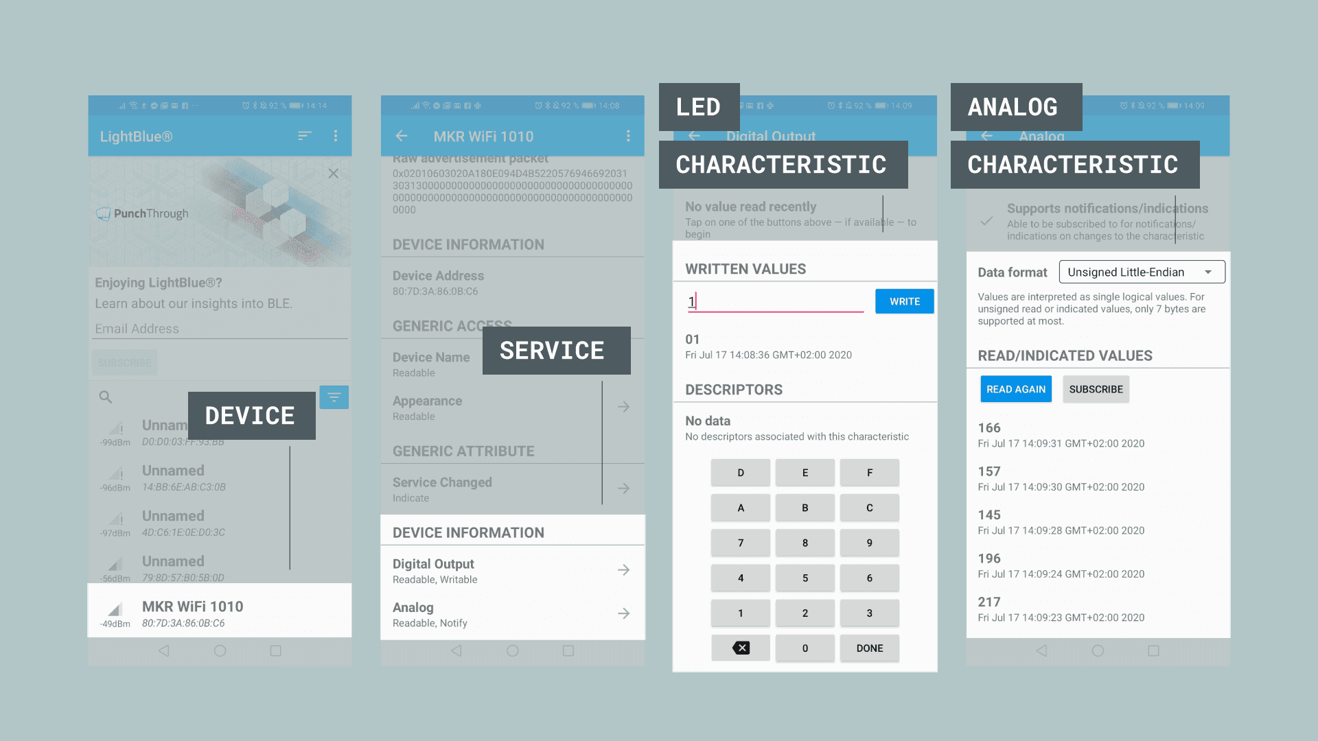 The goal with this tutorial is to be able to access our MKR WiFi 1010 board via Bluetooth®, and control an LED onboard it. We will also retrieve the latest readings from an analog pin. We will then use UUIDs from the official Bluetooth® page, that are compliant with GATT (Generic Attribute Profile). This way, when we access our device later, the service and characteristics can be recognized!