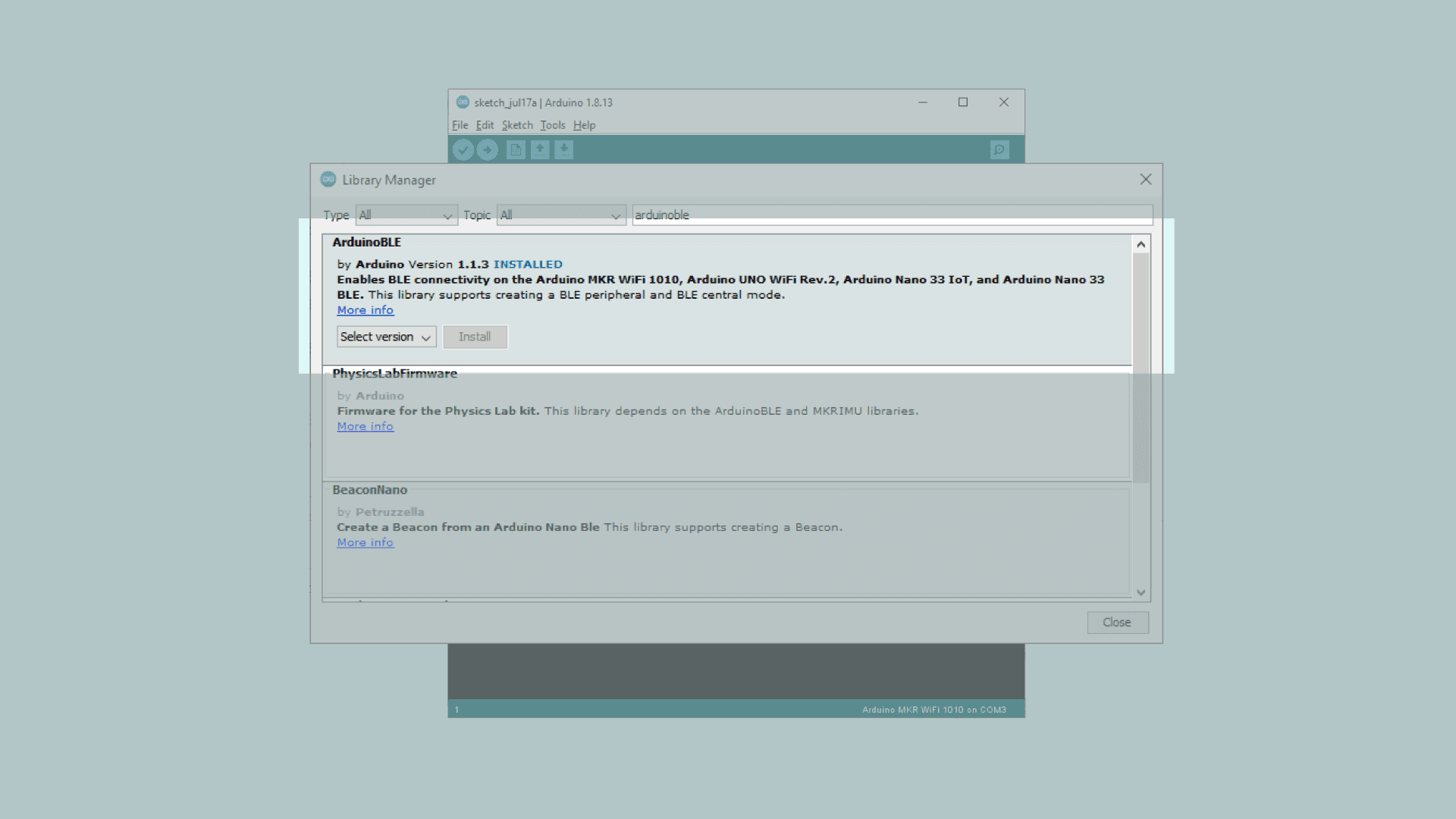 2. Now, we need to install the library needed. If we are using the Web Editor, there is no need to install anything. If we are using an offline editor, simply go to Tools > Manage libraries.., and search for ArduinoBLE and install it.