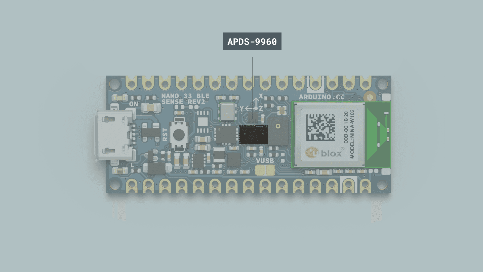 The APDS9960 chip allows for measuring digital proximity and ambient light as well as for detecting RGB colors and gestures.