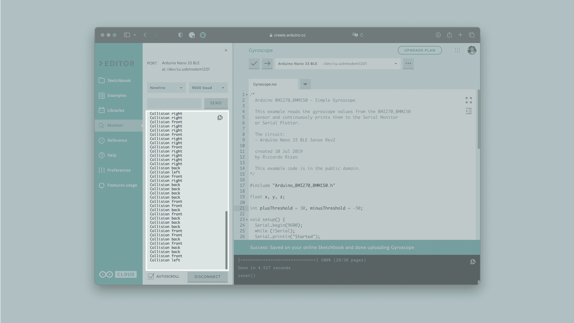 This tutorial will focus on the 3-axis gyroscope sensor of the IMU system on the Arduino Nano 33 BLE Sense Rev2, in order to measure the direction of force on the board to emulate an object's crash. This will be achieved by utilizing the values of the gyroscope's axes and later print the return values through the Arduino IDE Serial Monitor.