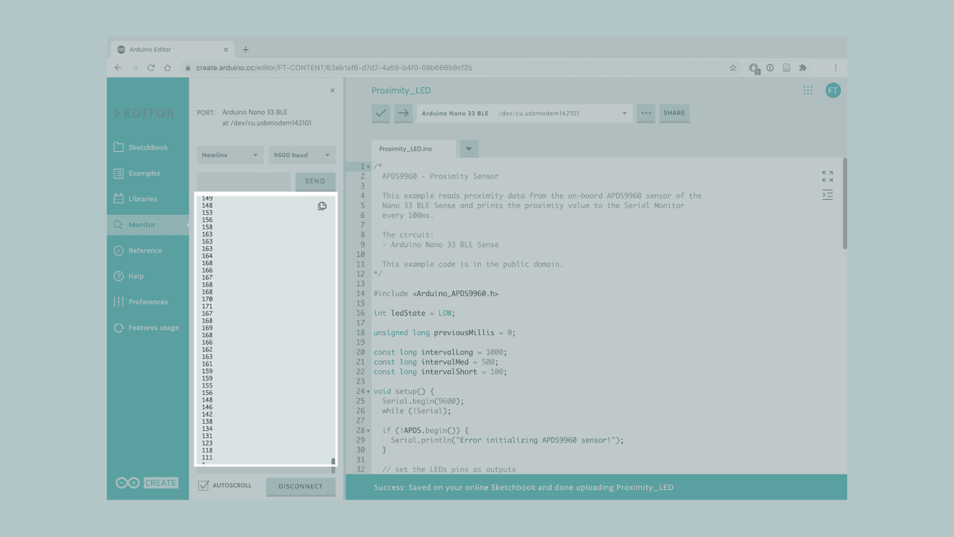 Let's start by opening the Arduino Web Editor, click on the Libraries tab and search for the APDS9960 library. Then in > Examples, open the ProximitySensor sketch and once it opens, you could rename is as Proximity_LED.