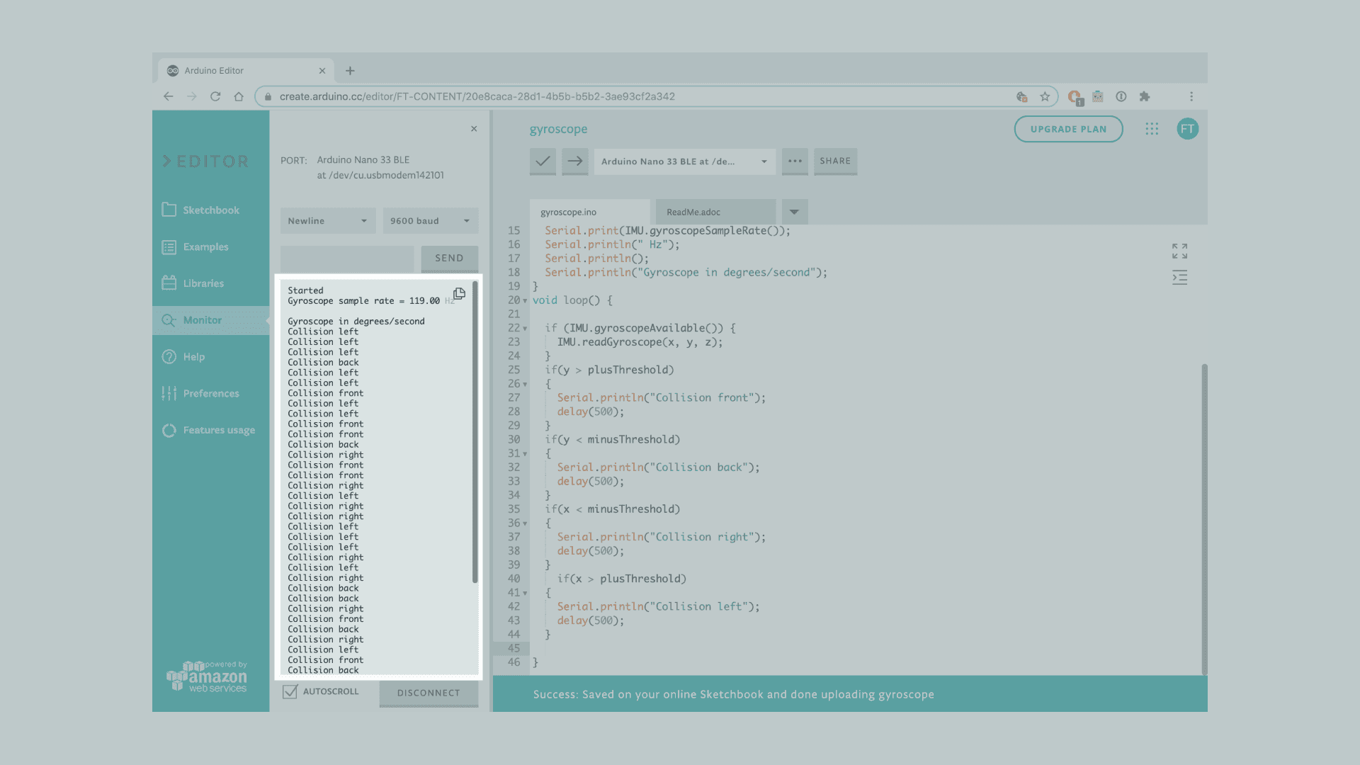 This tutorial will focus on the 3-axis gyroscope sensor of the LSM9DS1 module, on the Arduino Nano 33 BLE, in order to measure the direction of force on the board to emulate an object's crash. This will be achieved by utilizing the values of the gyroscope's axes and later print the return values through the Arduino IDE Serial Monitor.