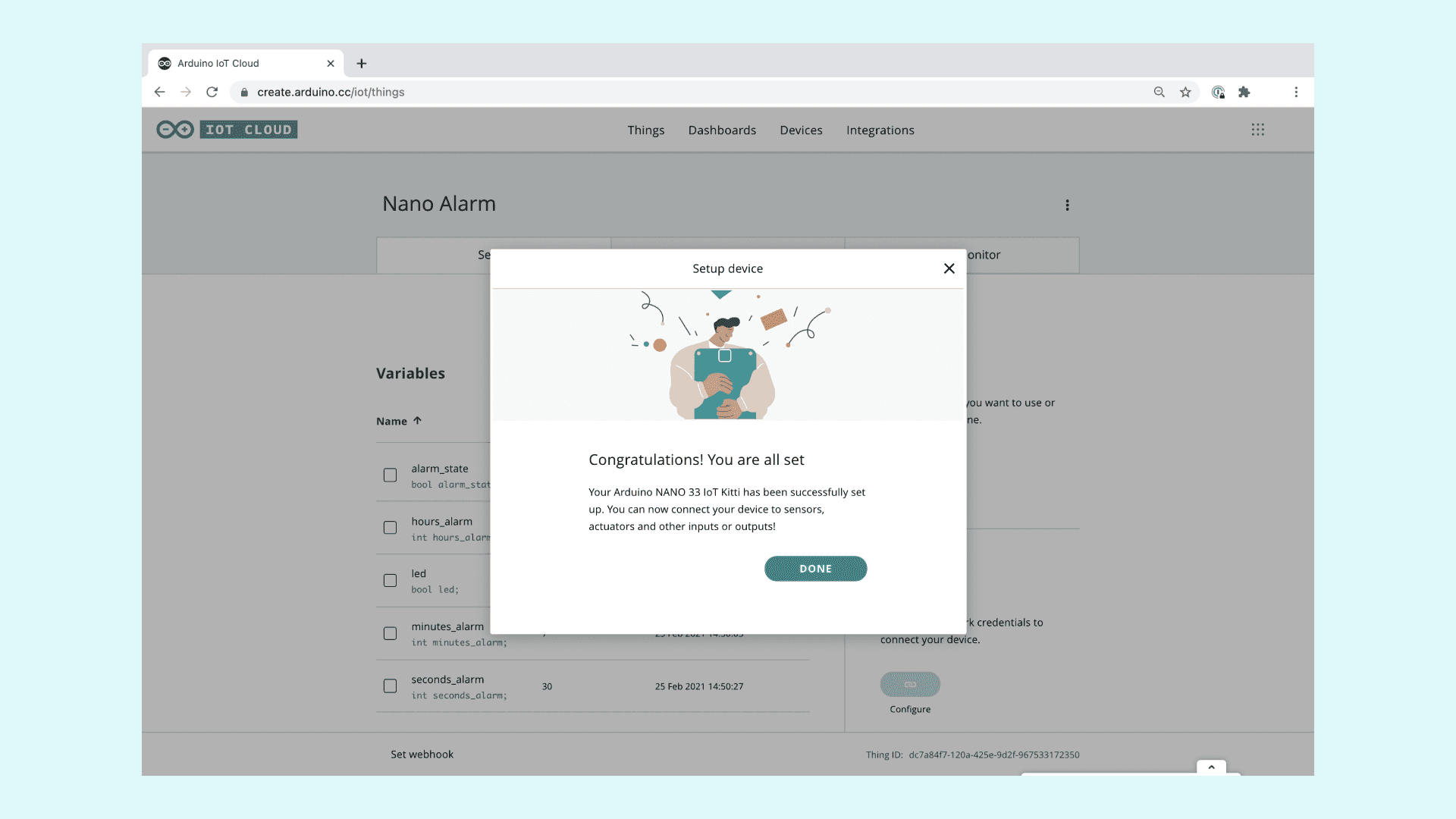 Let's start by opening the Arduino Cloud. Once we are in the Arduino Cloud, we will see the Things where we need to click the Create Thing button and rename it as Nano Alarm.