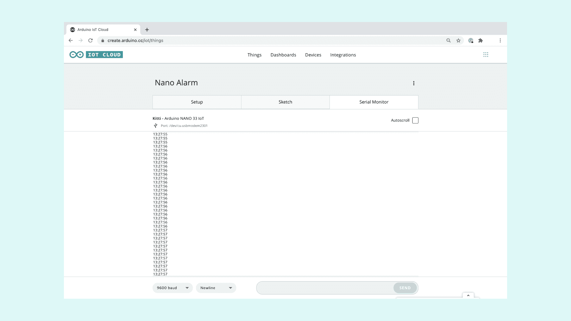 Once we are finished with the coding, we can upload the sketch to the board. When it has successfully uploaded, open the Serial Monitor. In the Serial Monitor, after initializing the communication between the board and the Cloud, we will see the time set as HH:MM:SS.