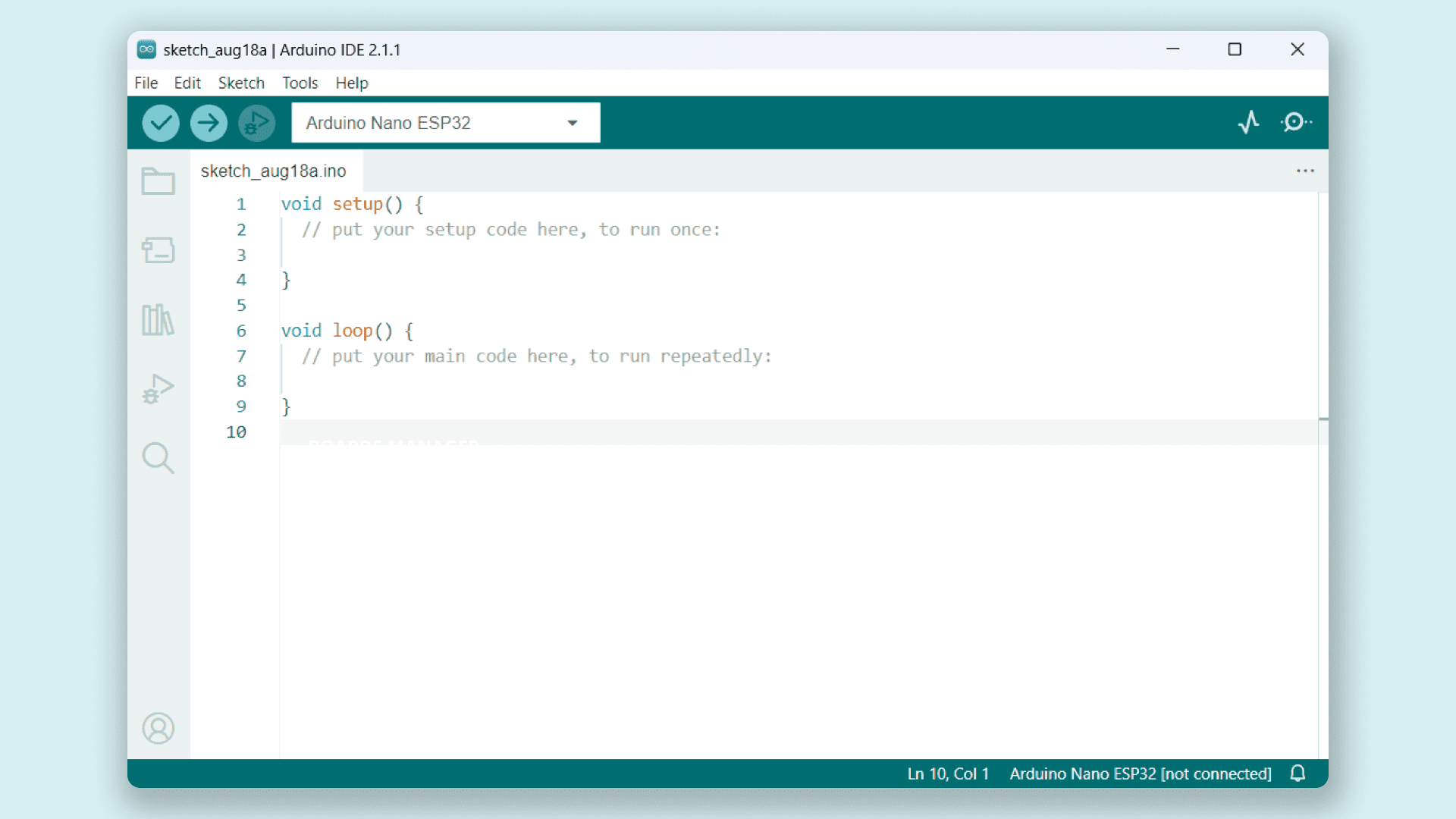 To install the board package, open the "Board Manager" from the menu to the left. Search for Nano ESP32 and install the latest version (or the version you want to use).